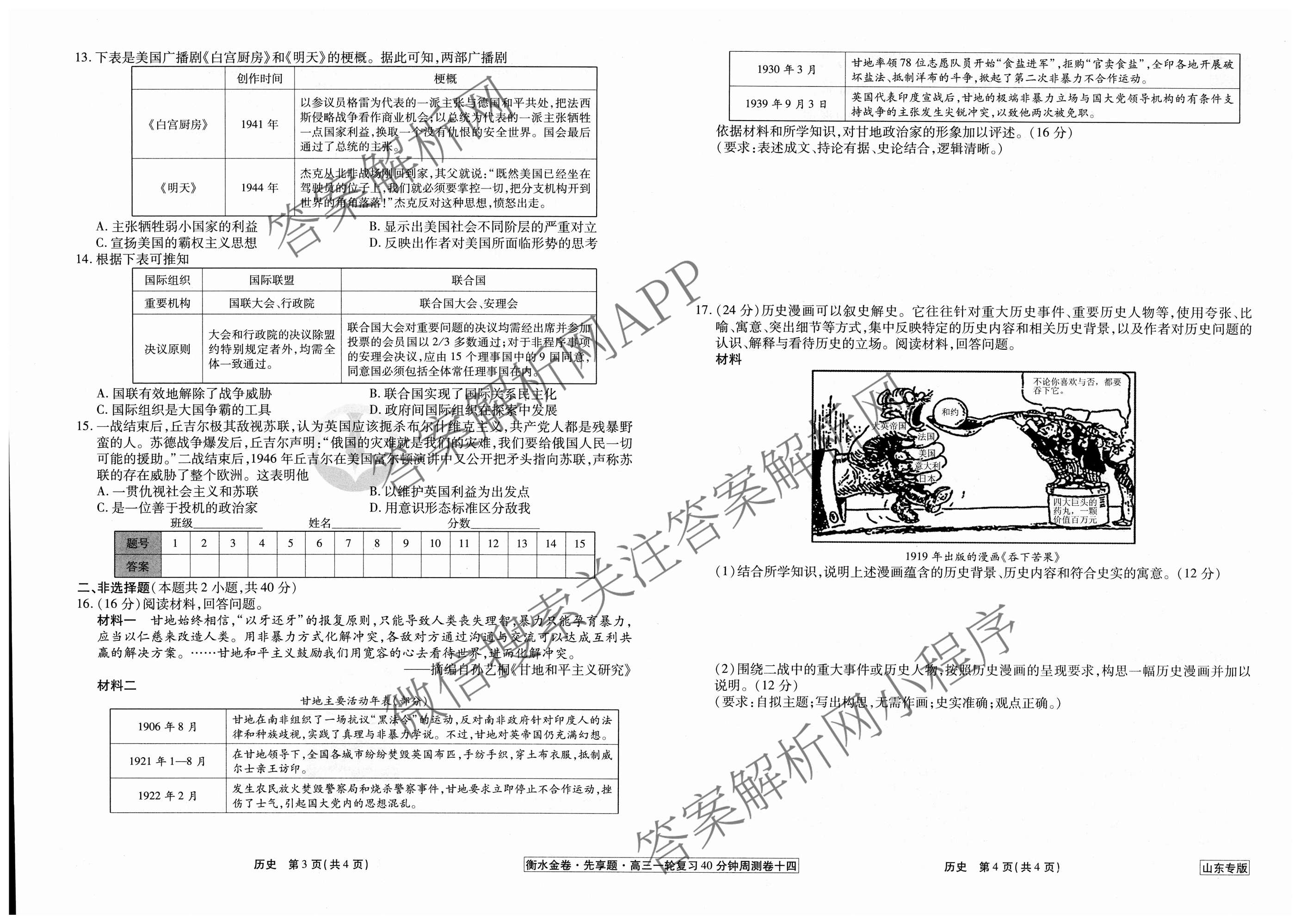 - 2024-2025(高三)[衡水金卷先享题]一轮复习40分钟周测卷历史(山东专版)(十四)14答案