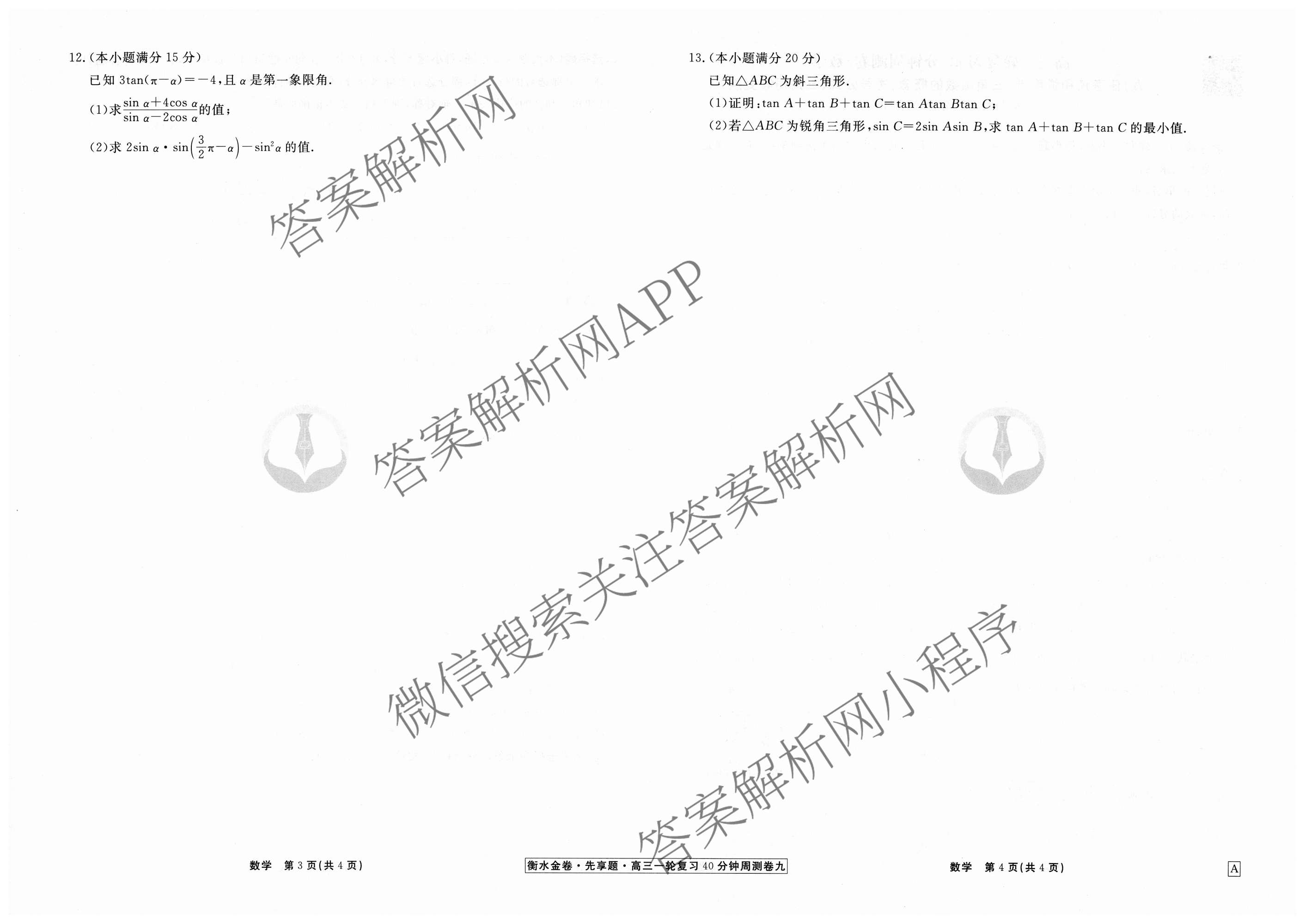 - (高三)2024~2025[衡水金卷先享题]一轮复习40分钟周测卷数学(A)(九)9答案