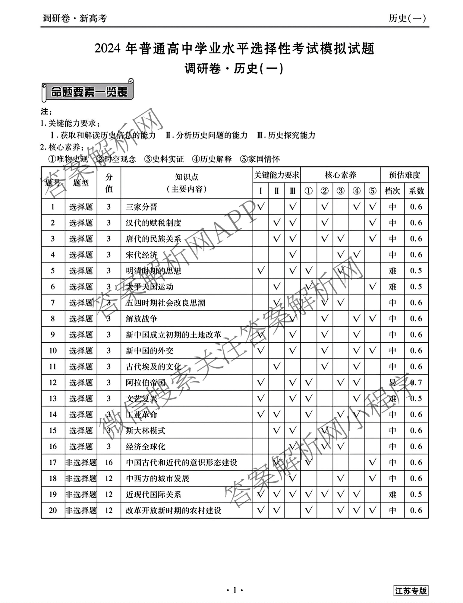 [衡水金卷先享题]调研卷 2024年普通高中学业水平选择性考试模拟试题(一)1历史(江苏专版)答案