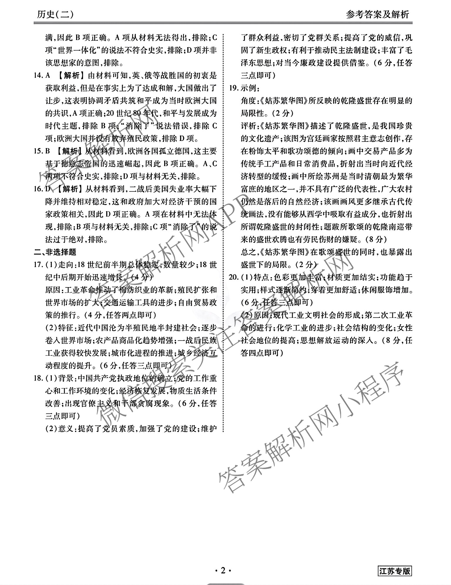 - [衡水金卷先享题]调研卷 2024年普通高中学业水平选择性考试模拟试题(二)2历史(江苏专版)答案