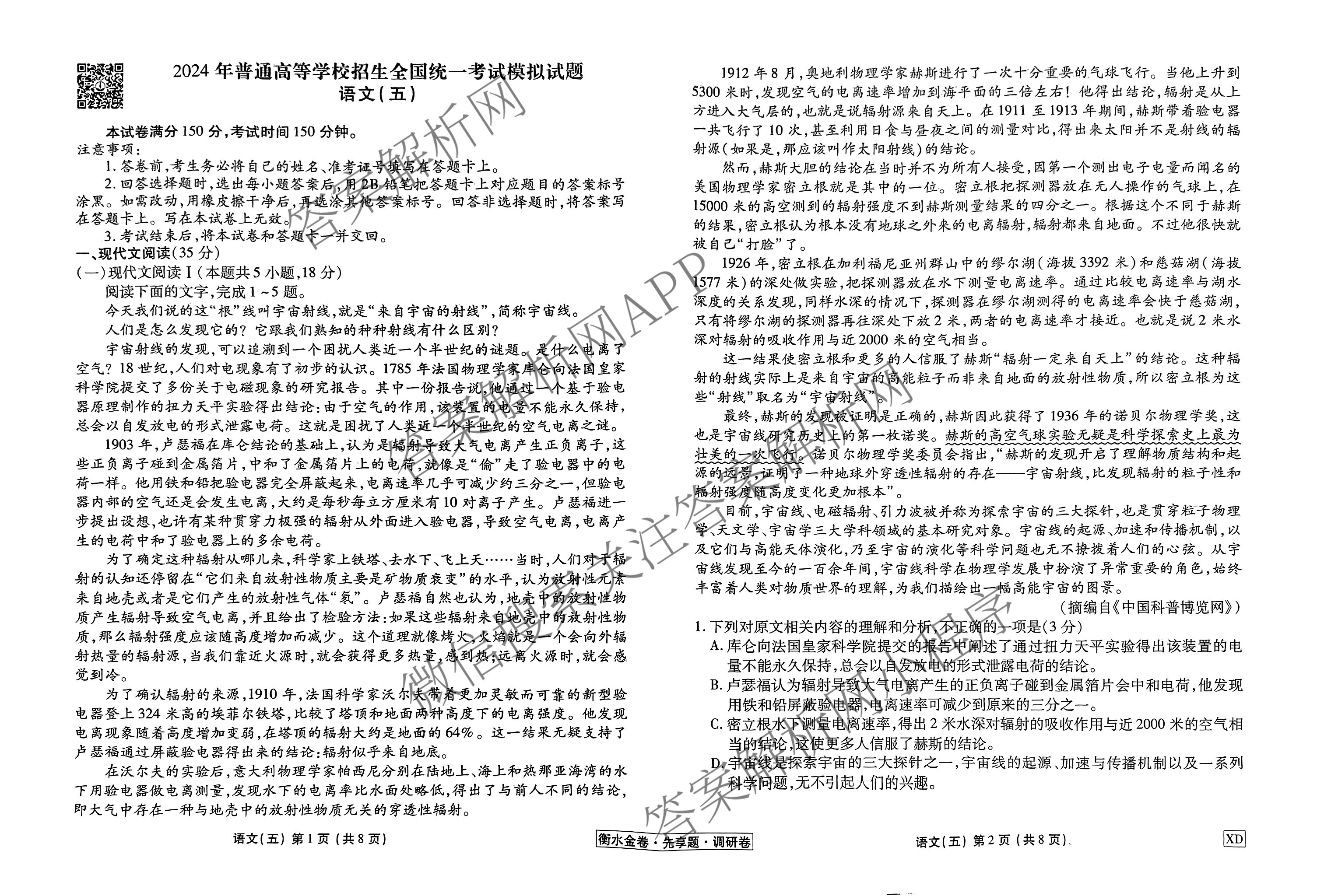 (衡水金卷先享题)调研卷 2024年普通高等学校招生全国统一考试模拟(五)5语文(XD)试题