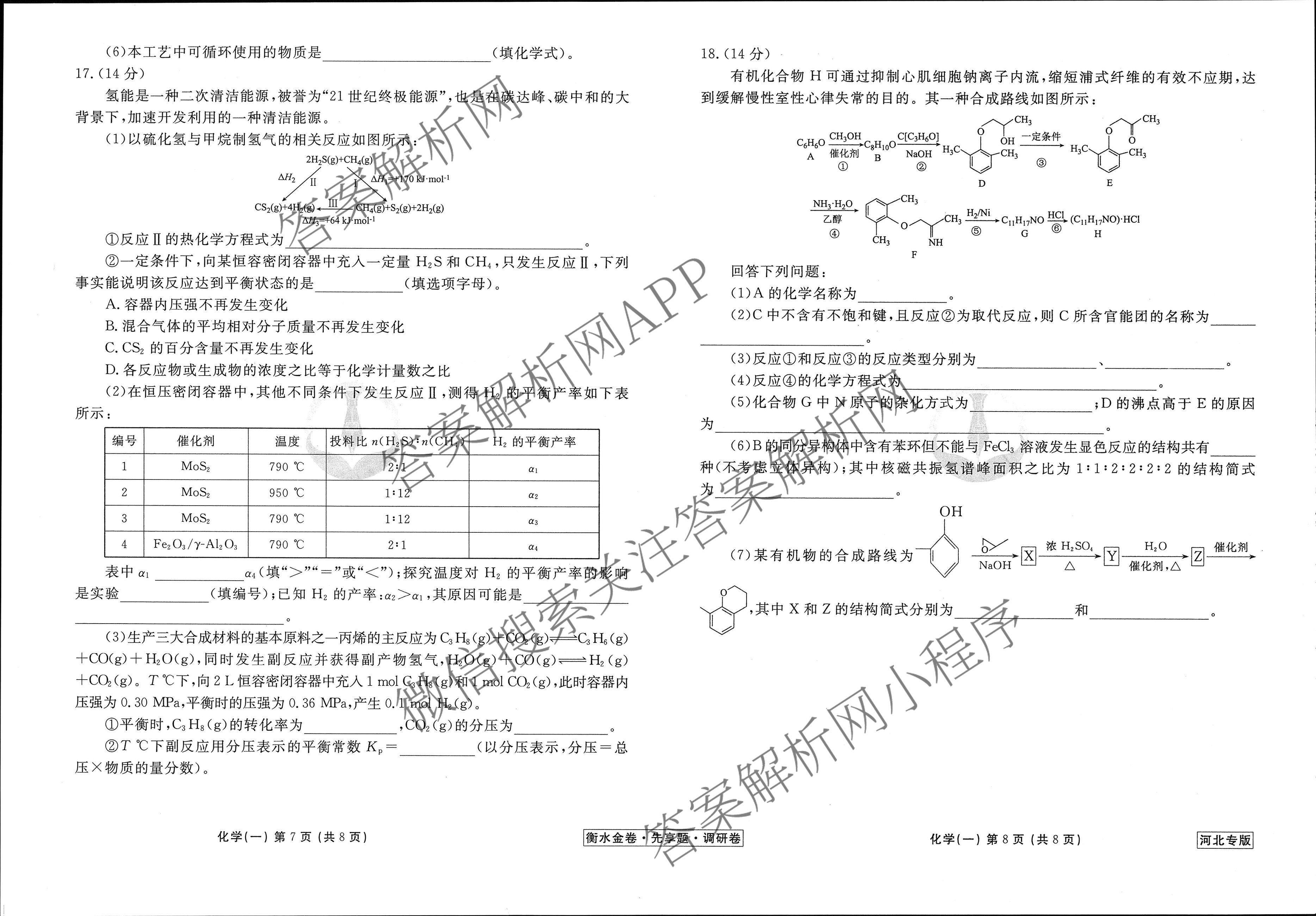 - [高三]衡水金卷先享题调研卷 2024年普通高中学业水平选择性考试模拟试题(一)1化学(山东专版)答案