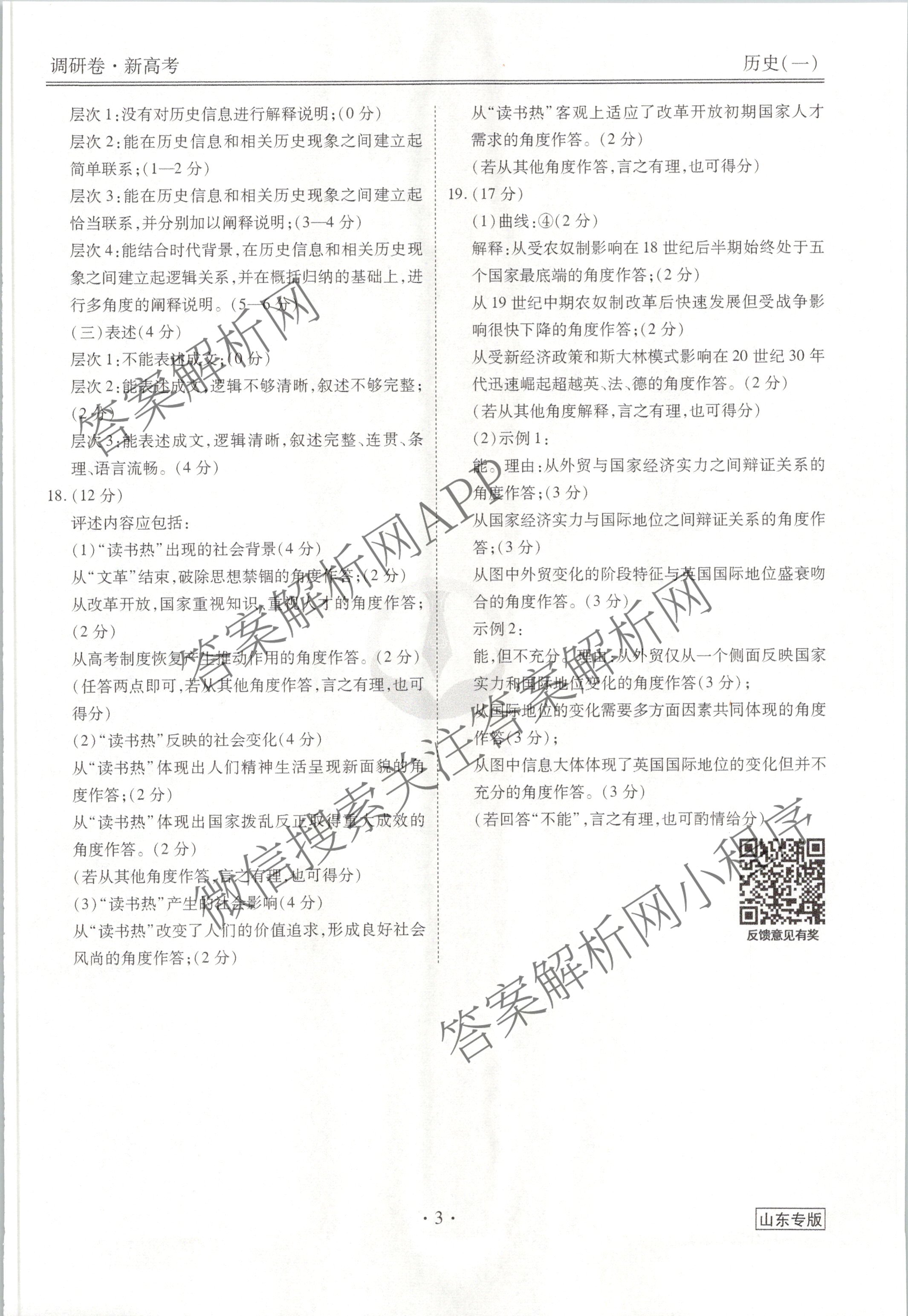 (衡水金卷先享题)调研卷 2024年普通高中学业水平选择性考试模拟试题(一)1历史(山东专版)答案
