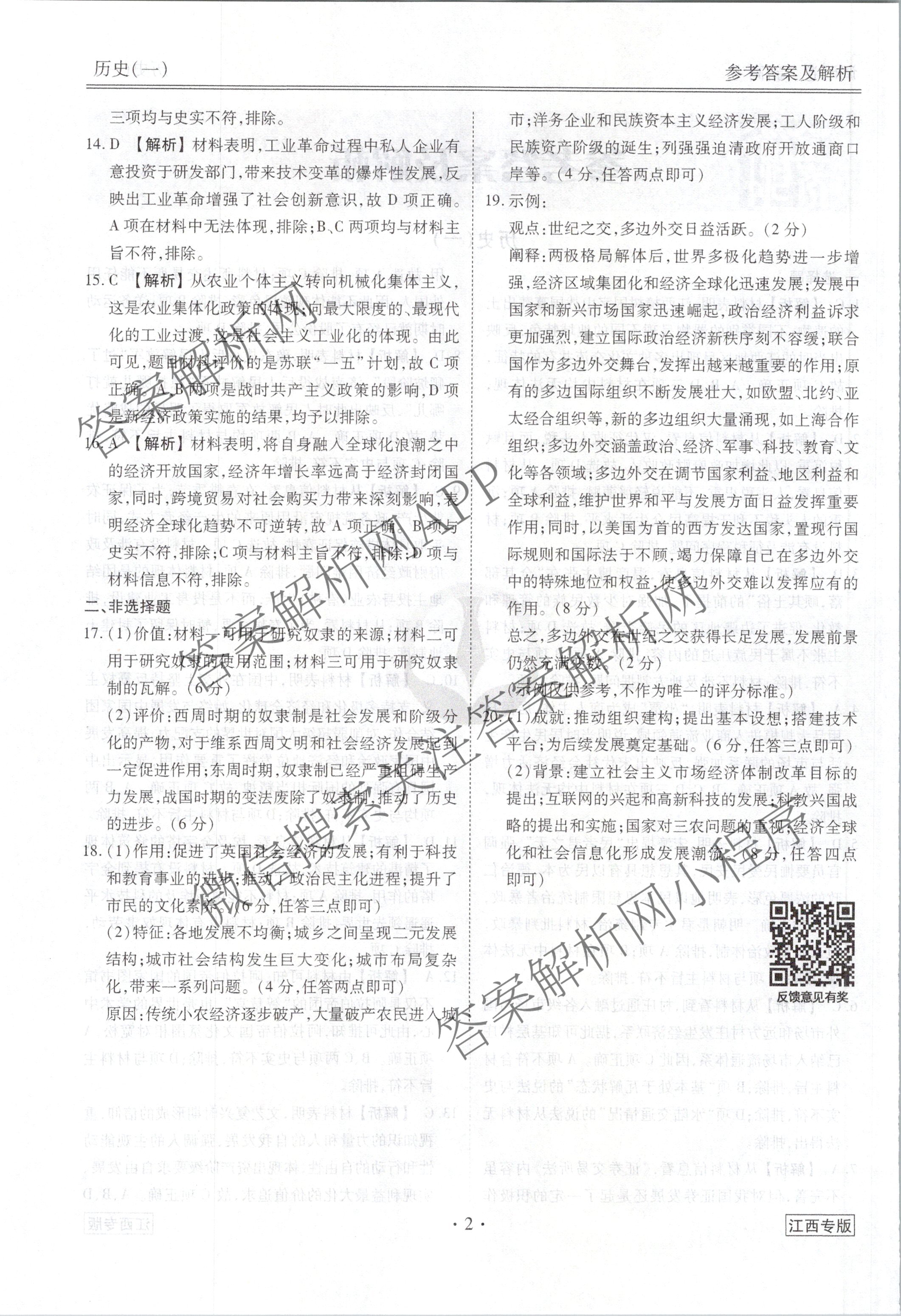 衡水金卷先享题调研卷 2024年普通高中学业水平选择性考试模拟试题(一)1历史(江西专版)答案