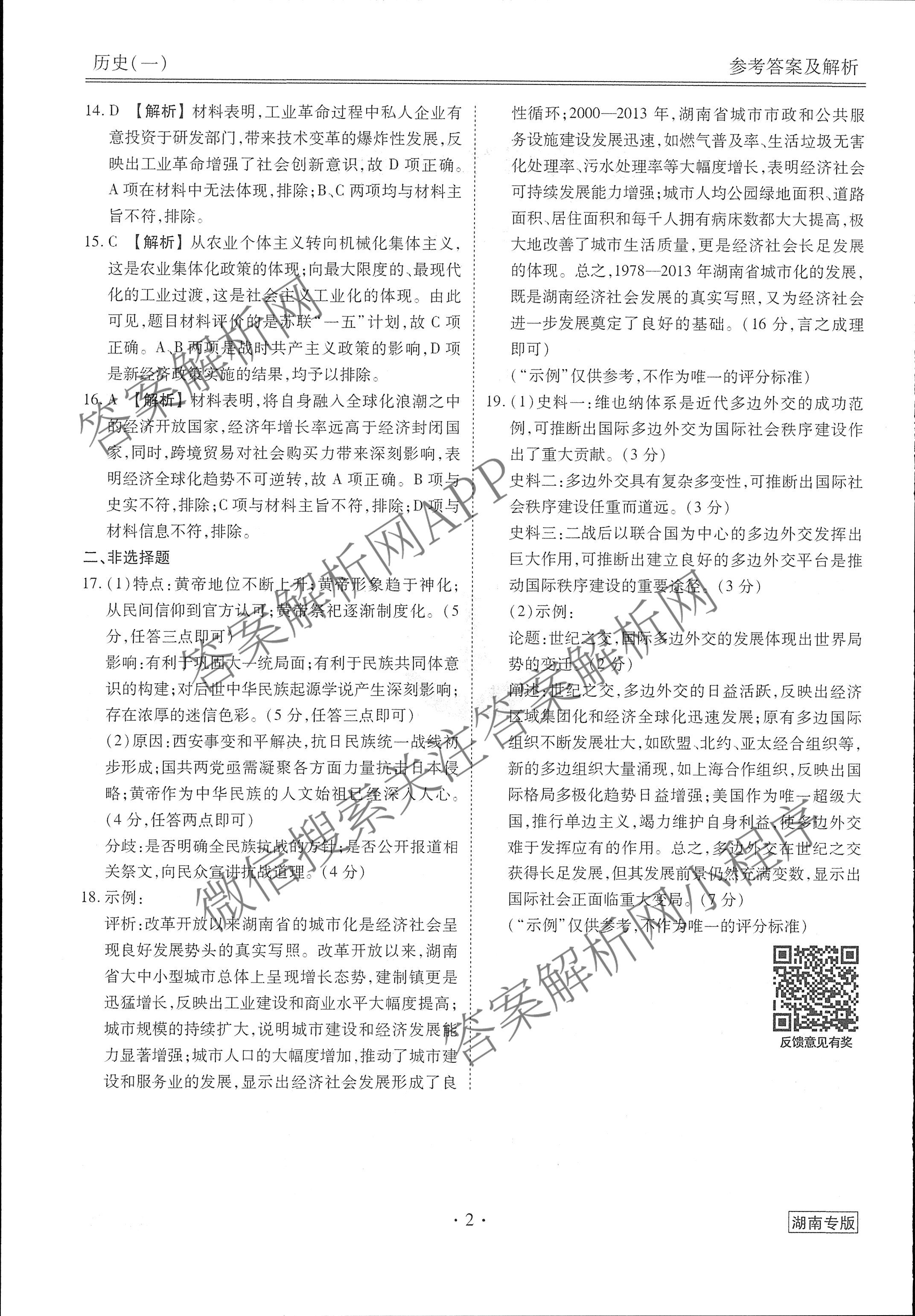 - 高三[衡水金卷先享题]·调研卷 2024年普通高中学业水平选择性考试模拟试题(一)1历史(湖南专版)答案