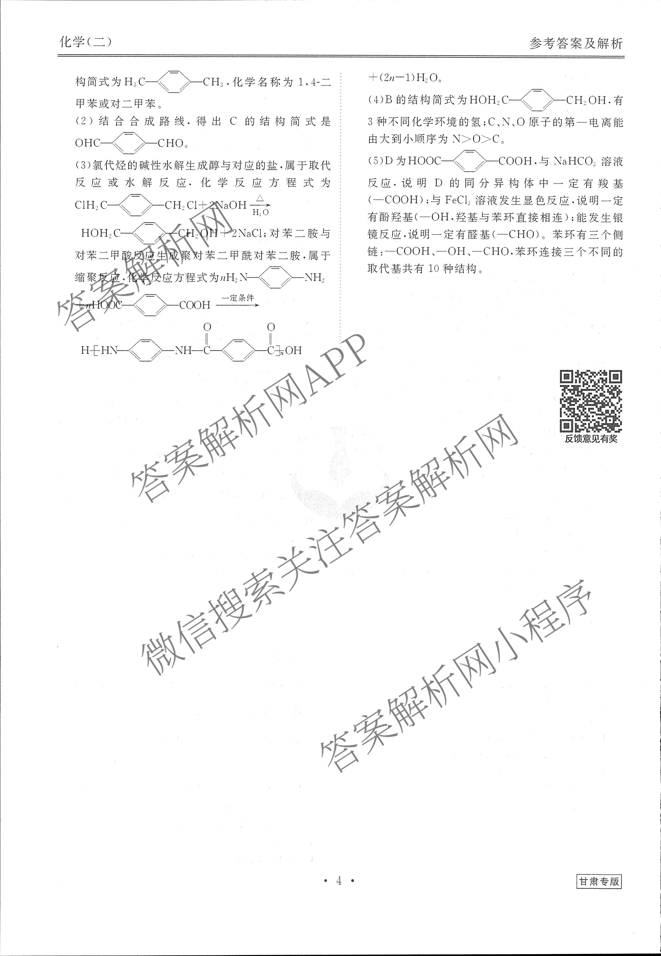 - [高三][衡水金卷先享题]·调研卷 2024年普通高中学业水平选择性考试模拟试题(二)2化学(甘肃专版)答案