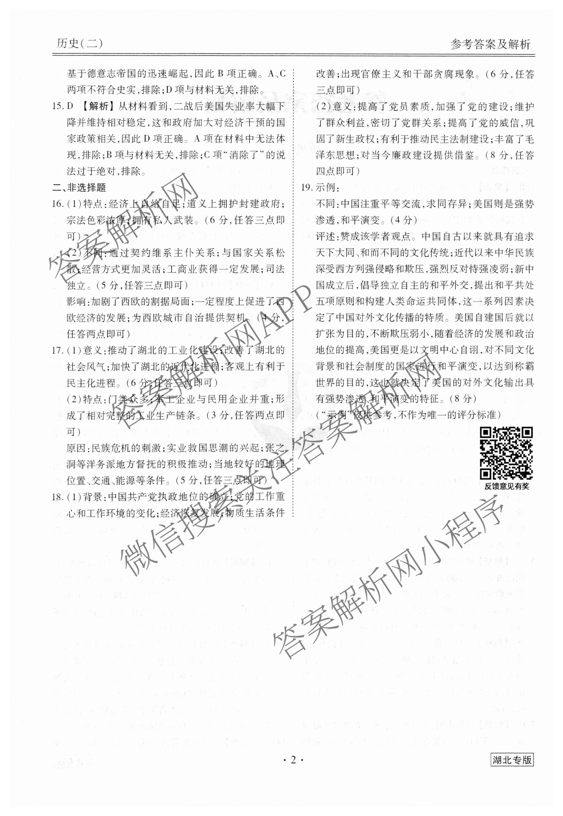 [高三](衡水金卷先享题)调研卷 2024年普通高中学业水平选择性考试模拟试题(二)2历史(湖北专版)答案