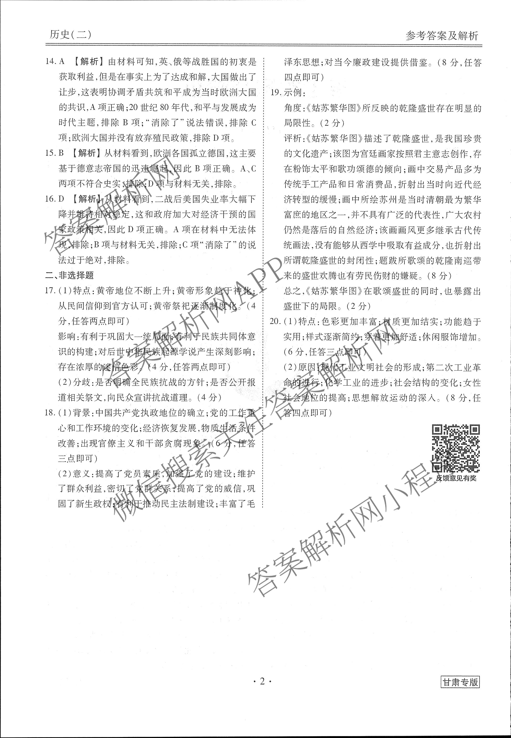 (高三)衡水金卷先享题调研卷 2024年普通高中学业水平选择性考试模拟试题(二)2历史(甘肃专版)答案