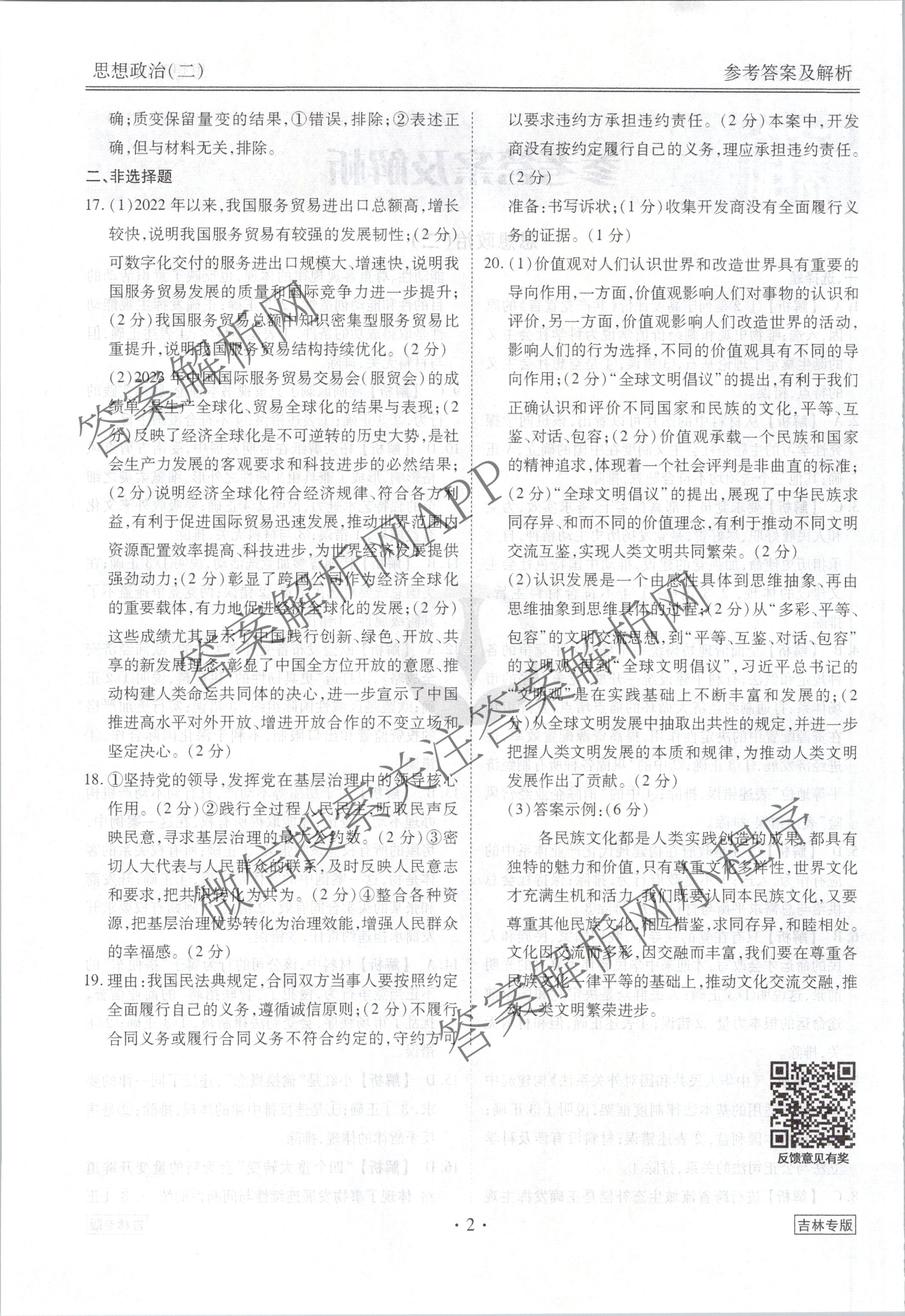 高三[衡水金卷先享题]调研卷 2024年普通高中学业水平选择性考试模拟试题(二)2政治(吉林专版)答案