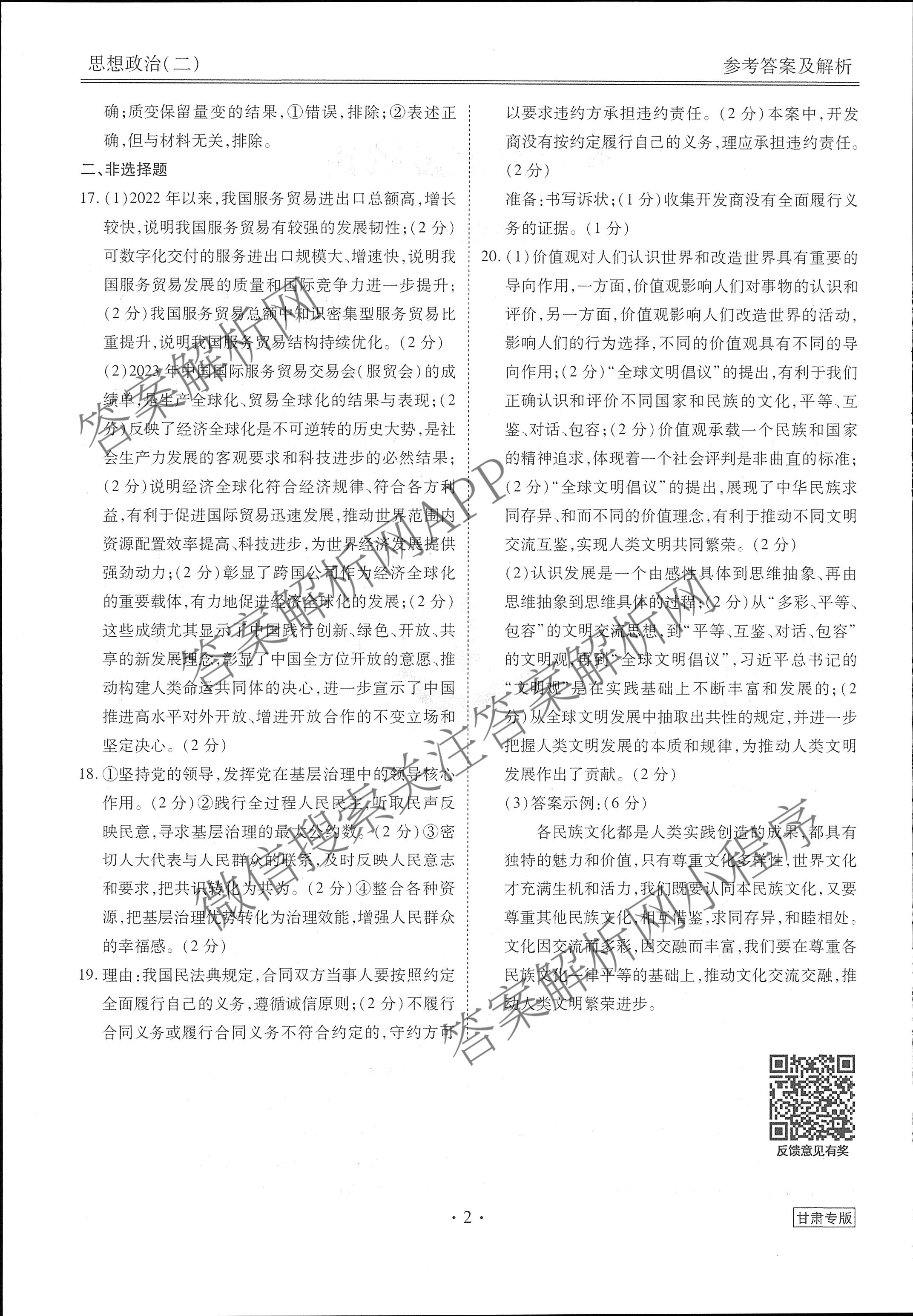[衡水金卷先享题]·调研卷 2024年普通高中学业水平选择性考试模拟试题(二)2政治(甘肃专版)答案