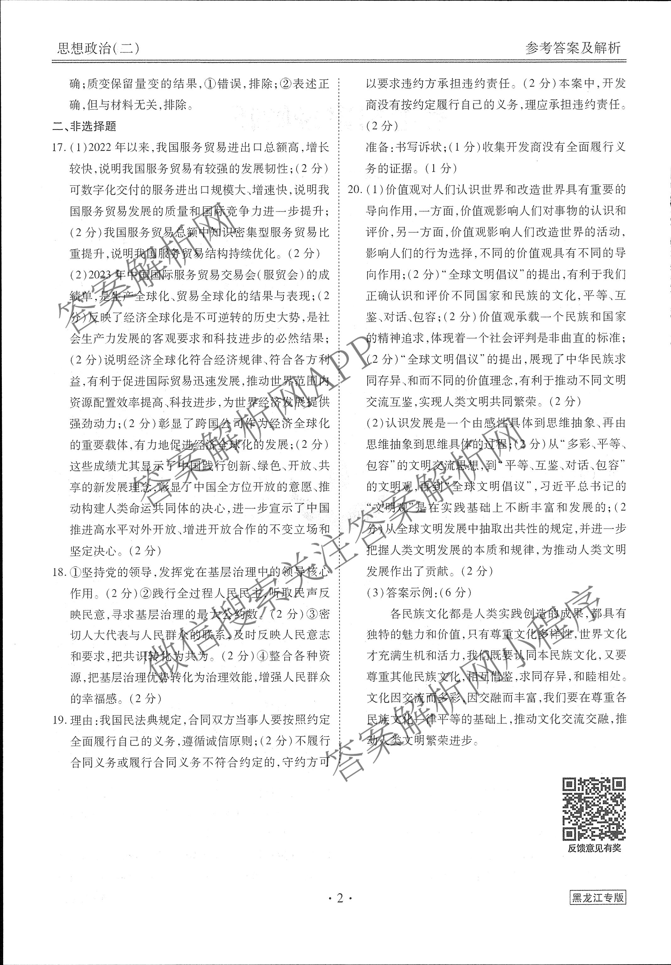 [高三][衡水金卷先享题]·调研卷 2024年普通高中学业水平选择性考试模拟试题(二)2政治(黑龙江专版)答案