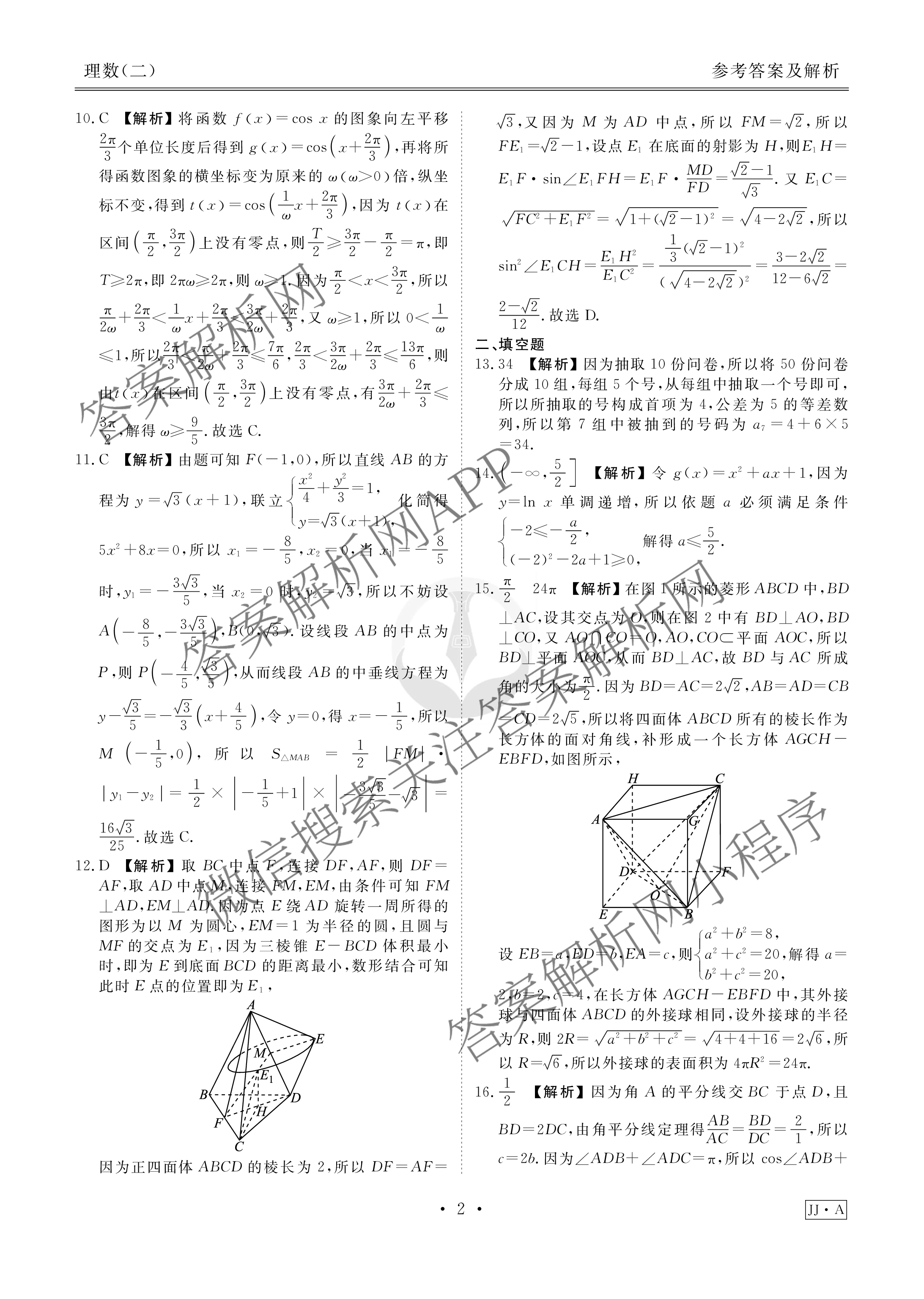 (衡水金卷先享题)调研卷 2024年普通高等学校招生全国统一考试模拟试题(二)2理数(JJA)答案
