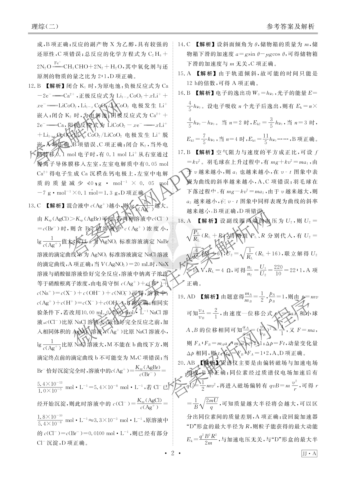 (衡水金卷先享题)·调研卷 2024年普通高等学校招生全国统一考试模拟试题(二)2理综(JJ·A)答案