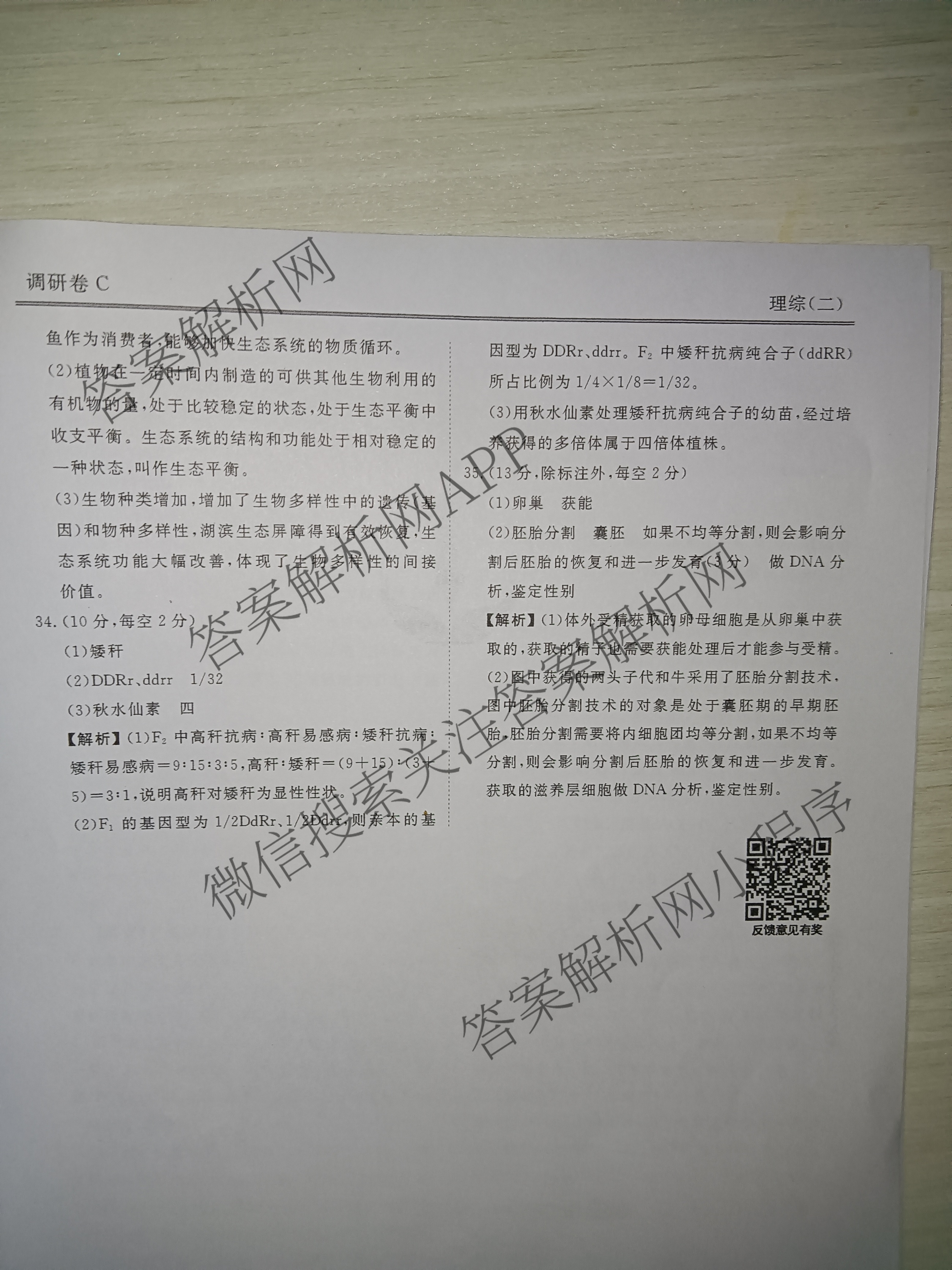 (高三)(衡水金卷先享题)·调研卷 2024年普通高等学校招生全国统一考试模拟试题(二)2理综(新教材C)答案