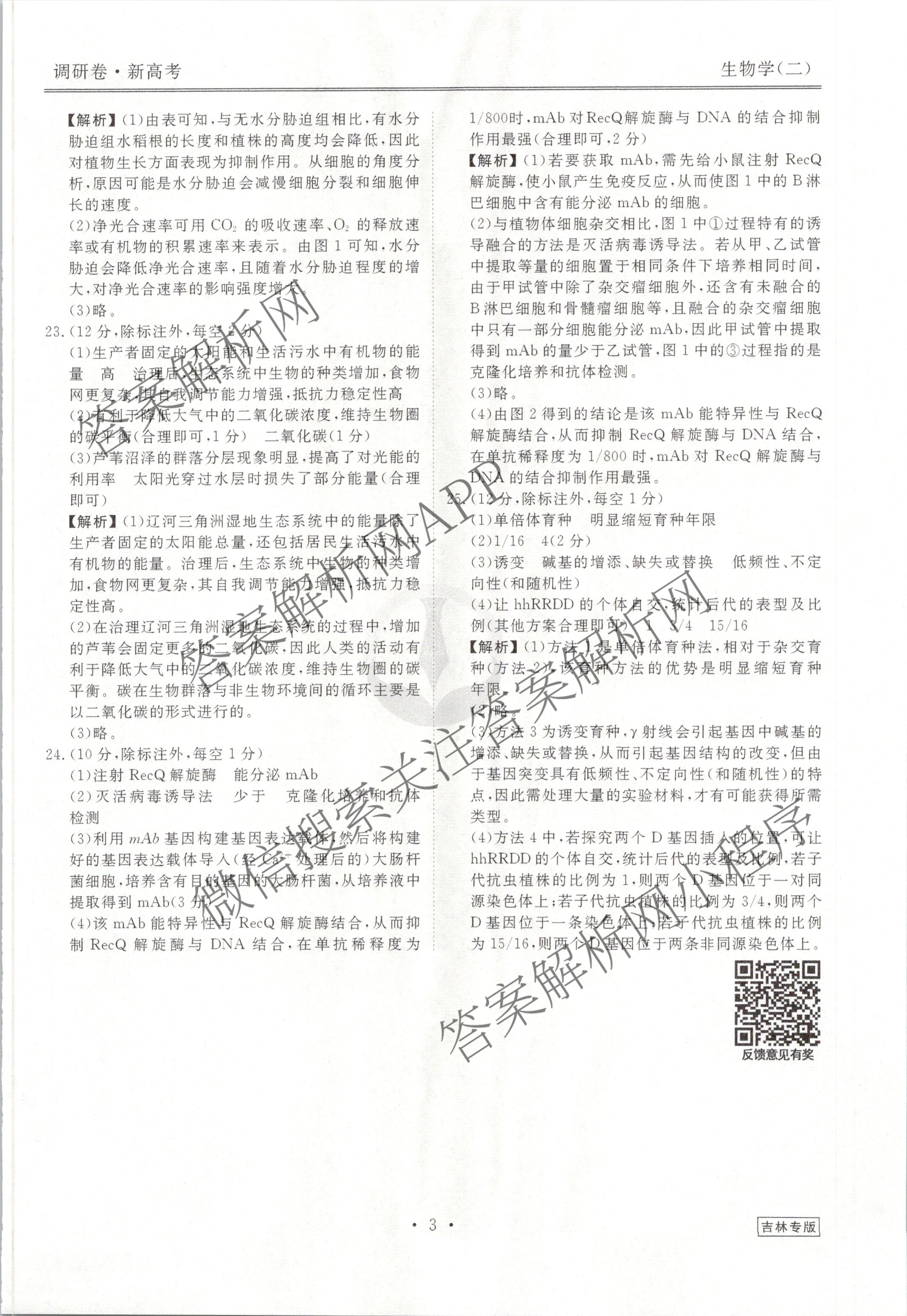 [高三]衡水金卷先享题调研卷 2024年普通高中学业水平选择性考试模拟试题(二)2生物(吉林专版)答案