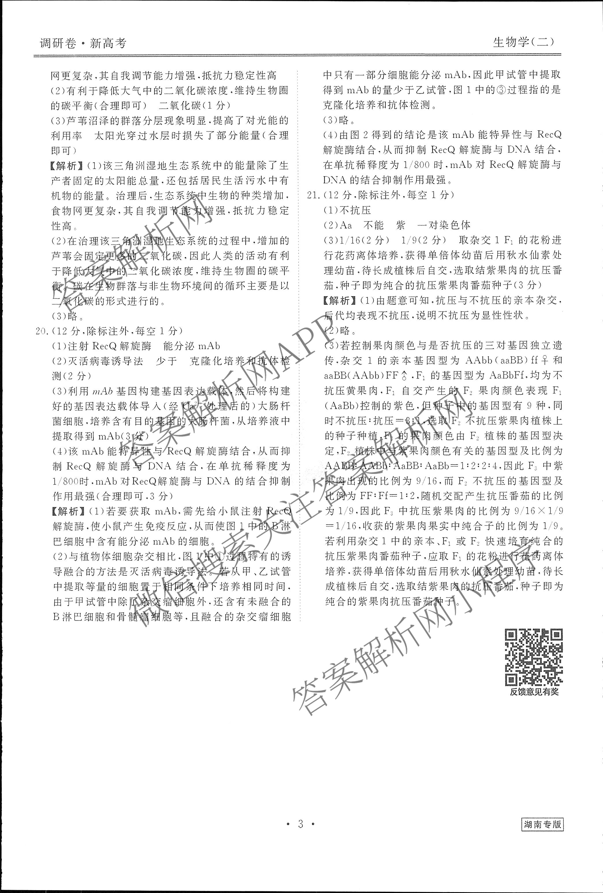 高三(衡水金卷先享题)调研卷 2024年普通高中学业水平选择性考试模拟试题(二)2生物(湖南专版)答案