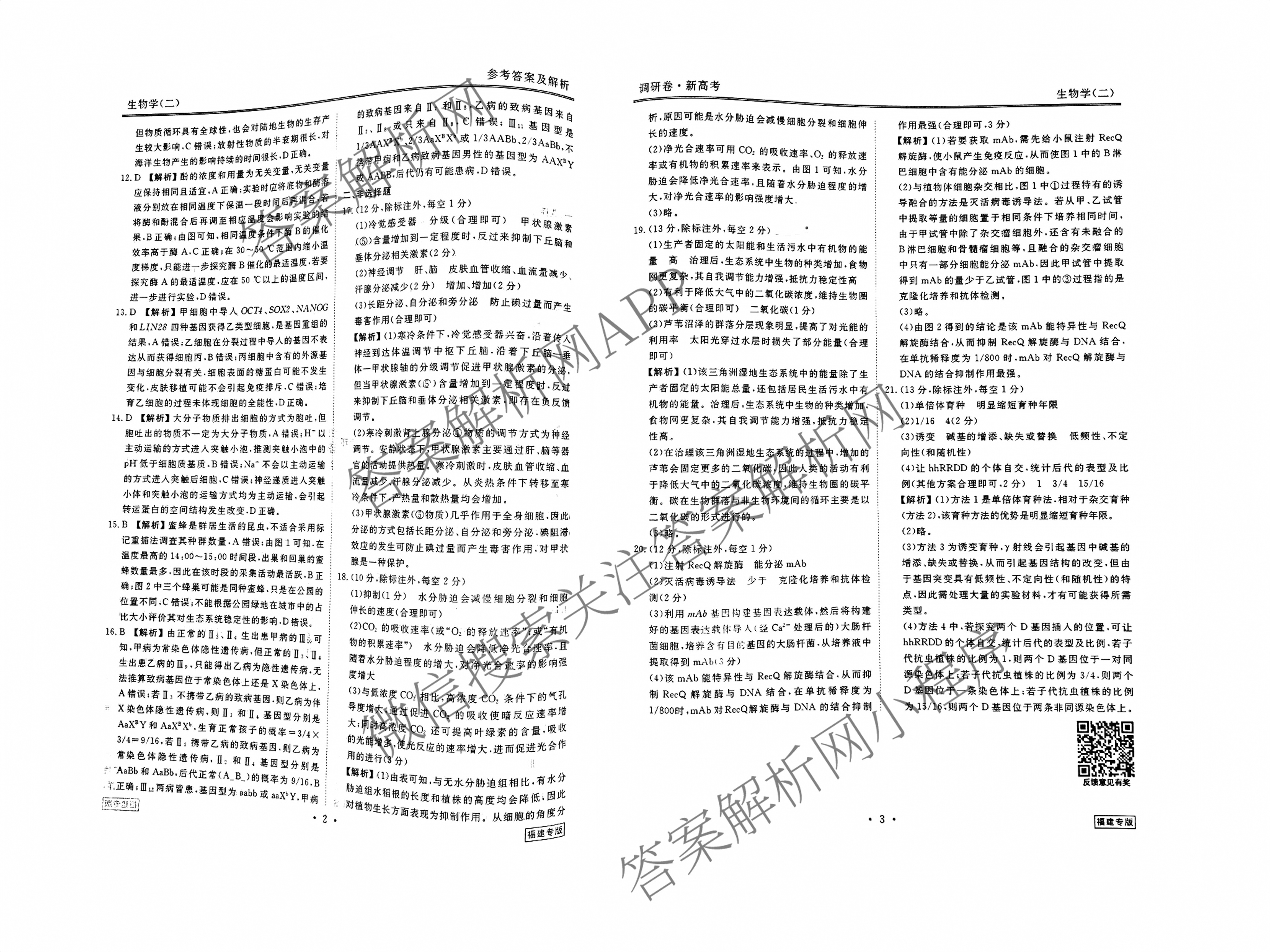 [衡水金卷先享题]·调研卷 2024年普通高中学业水平选择性考试模拟试题(二)2生物(福建专版)答案