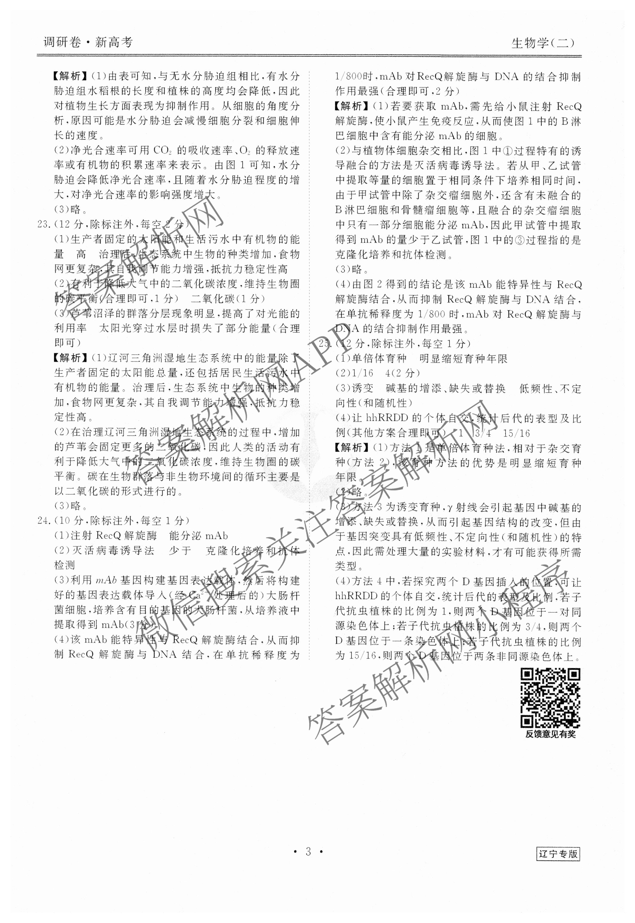 [高三][衡水金卷先享题]·调研卷 2024年普通高中学业水平选择性考试模拟试题(二)2生物(辽宁专版)答案