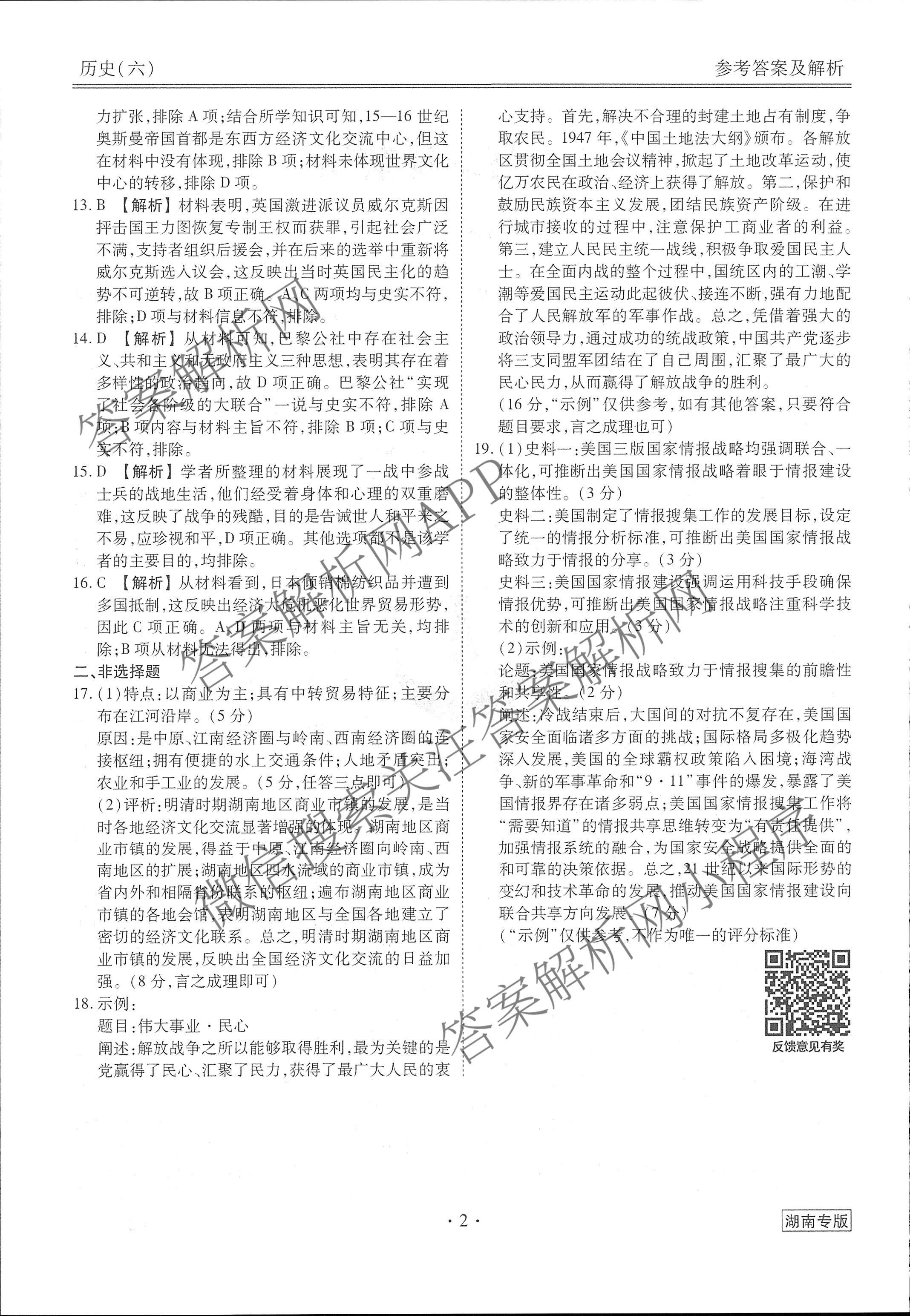 (衡水金卷先享题)调研卷 2024年普通高中学业水平选择性考试模拟试题(六)6历史(湖南专版)答案