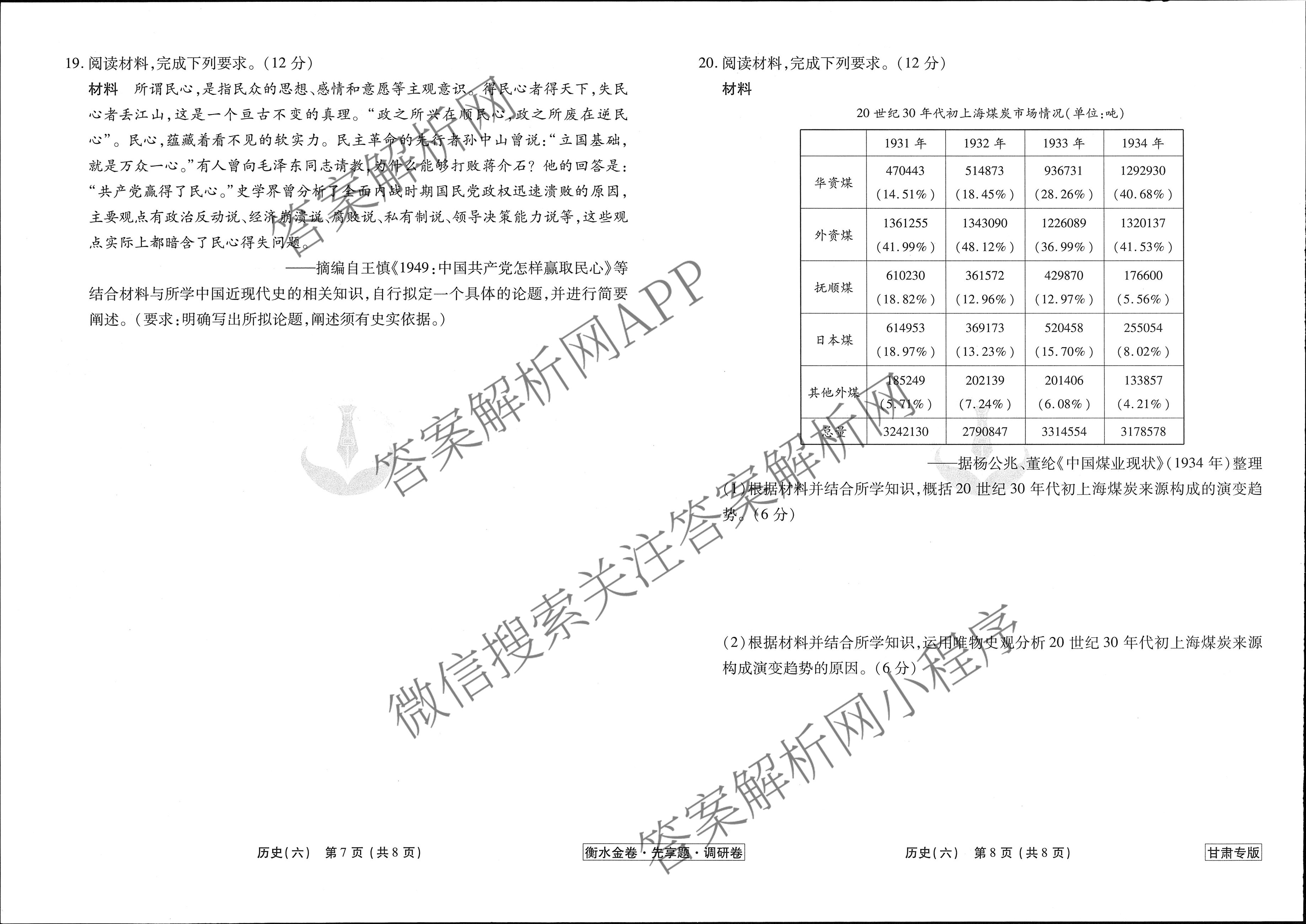 - [高三][衡水金卷先享题]调研卷 2024年普通高中学业水平选择性考试模拟试题(六)6历史(甘肃专版)答案
