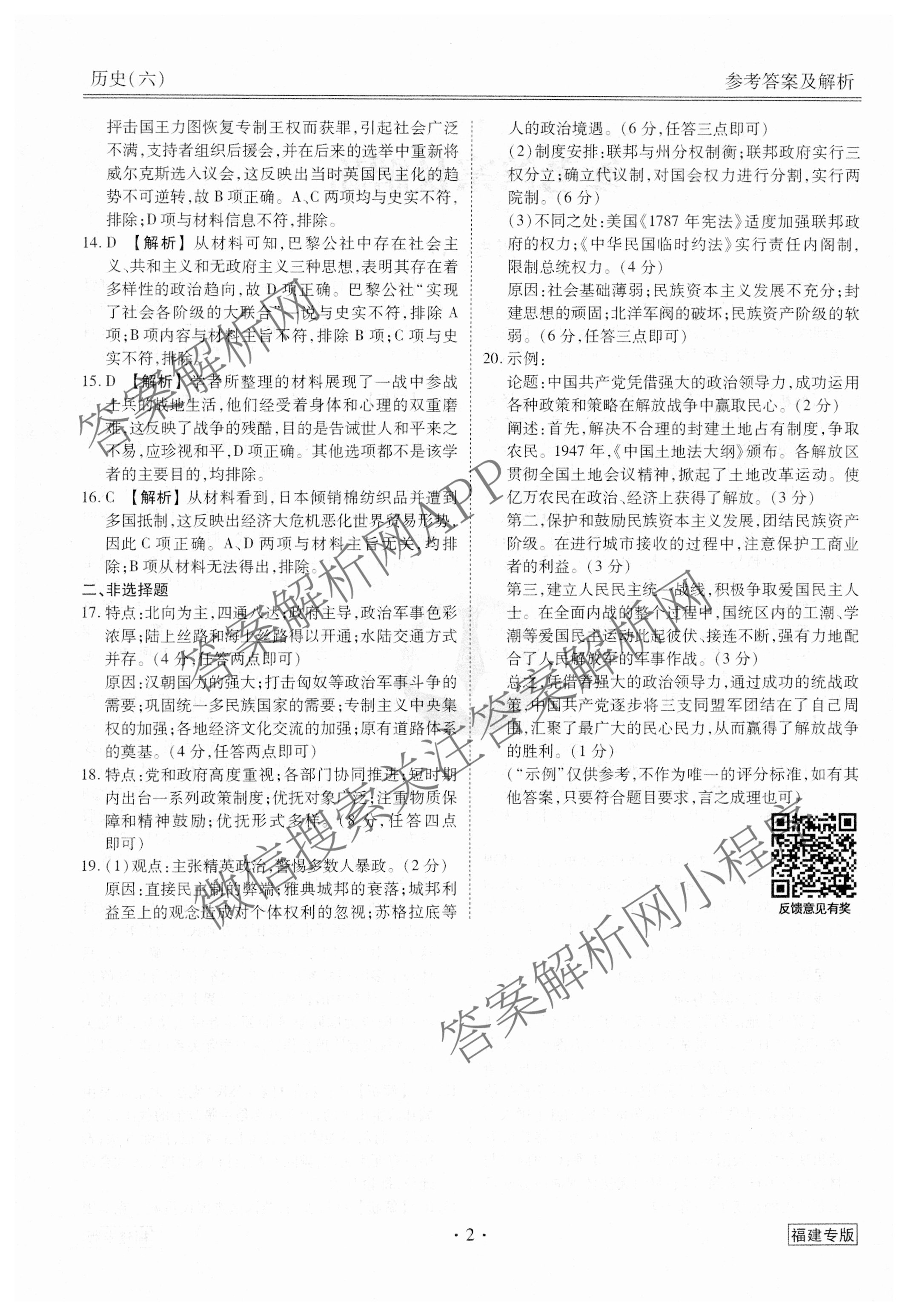(衡水金卷先享题)调研卷 2024年普通高中学业水平选择性考试模拟试题(六)6历史(福建专版)答案