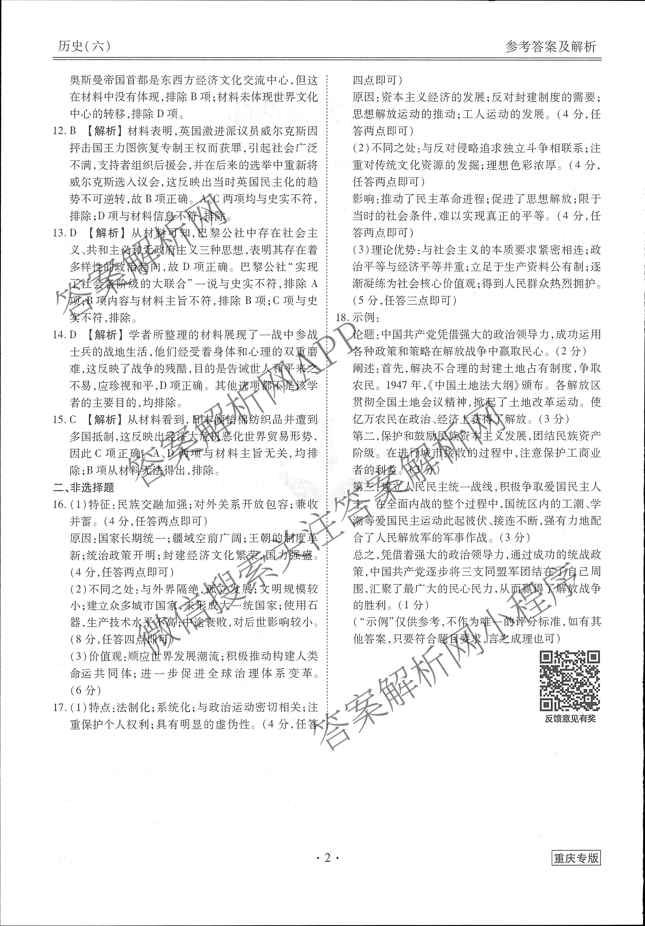 [衡水金卷先享题]调研卷 2024年普通高中学业水平选择性考试模拟试题(六)6历史(重庆专版)答案