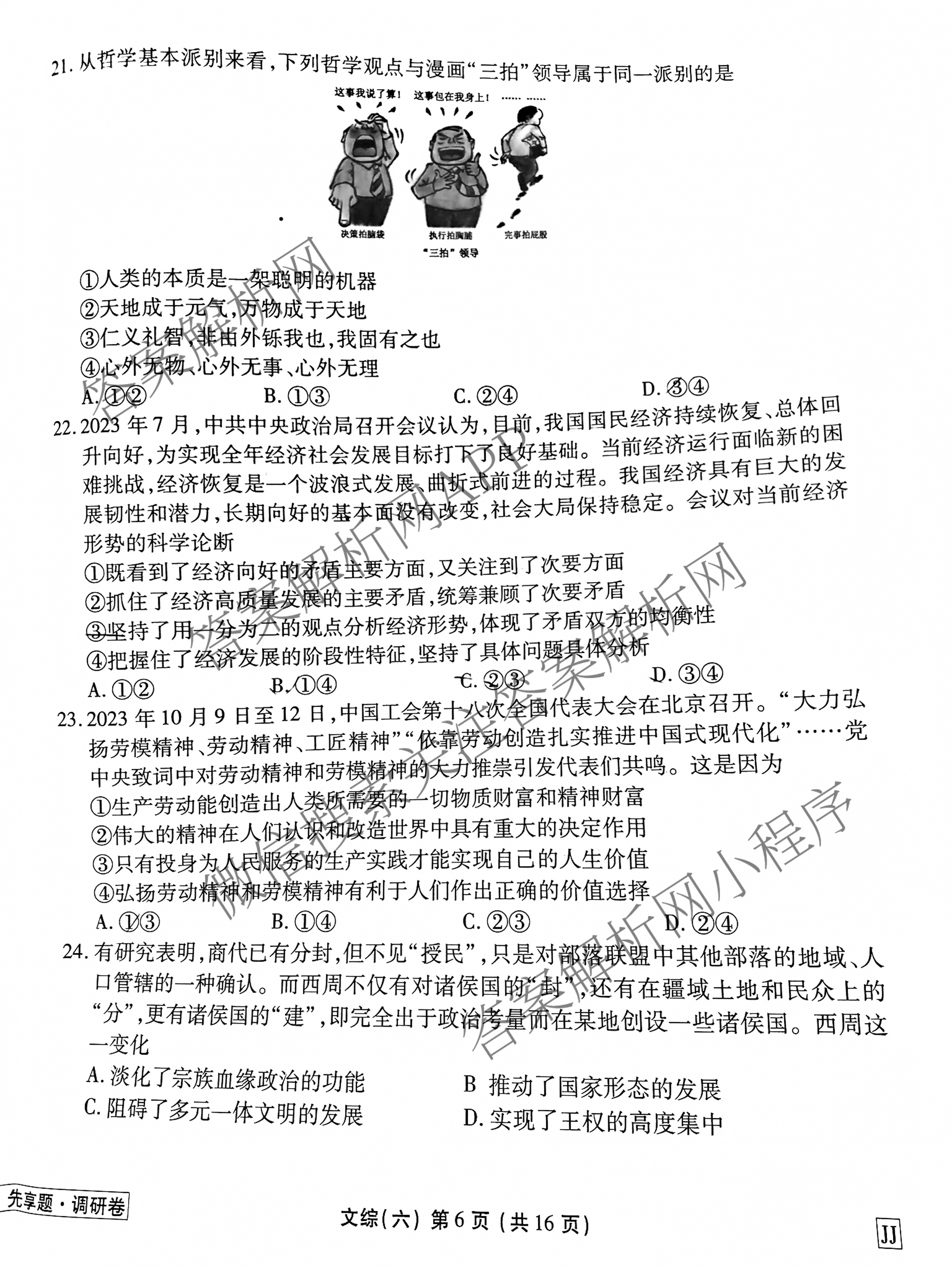 [衡水金卷先享题]调研卷 2024年普通高等学校招生全国统一考试模拟(六)6文综(JJ)试题