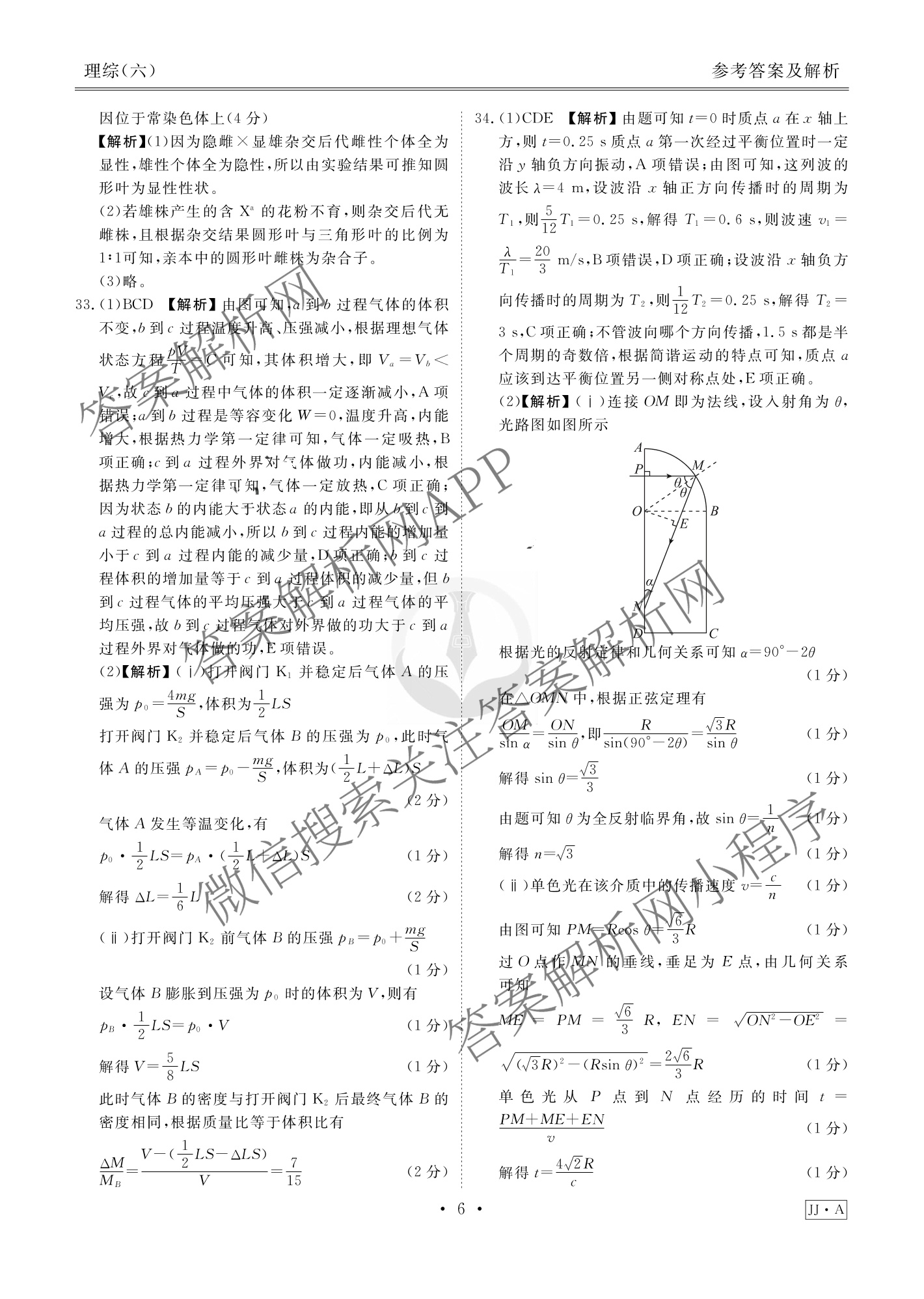 (衡水金卷先享题)调研卷 2024年普通高等学校招生全国统一考试模拟试题(六)6理综(JJA)答案