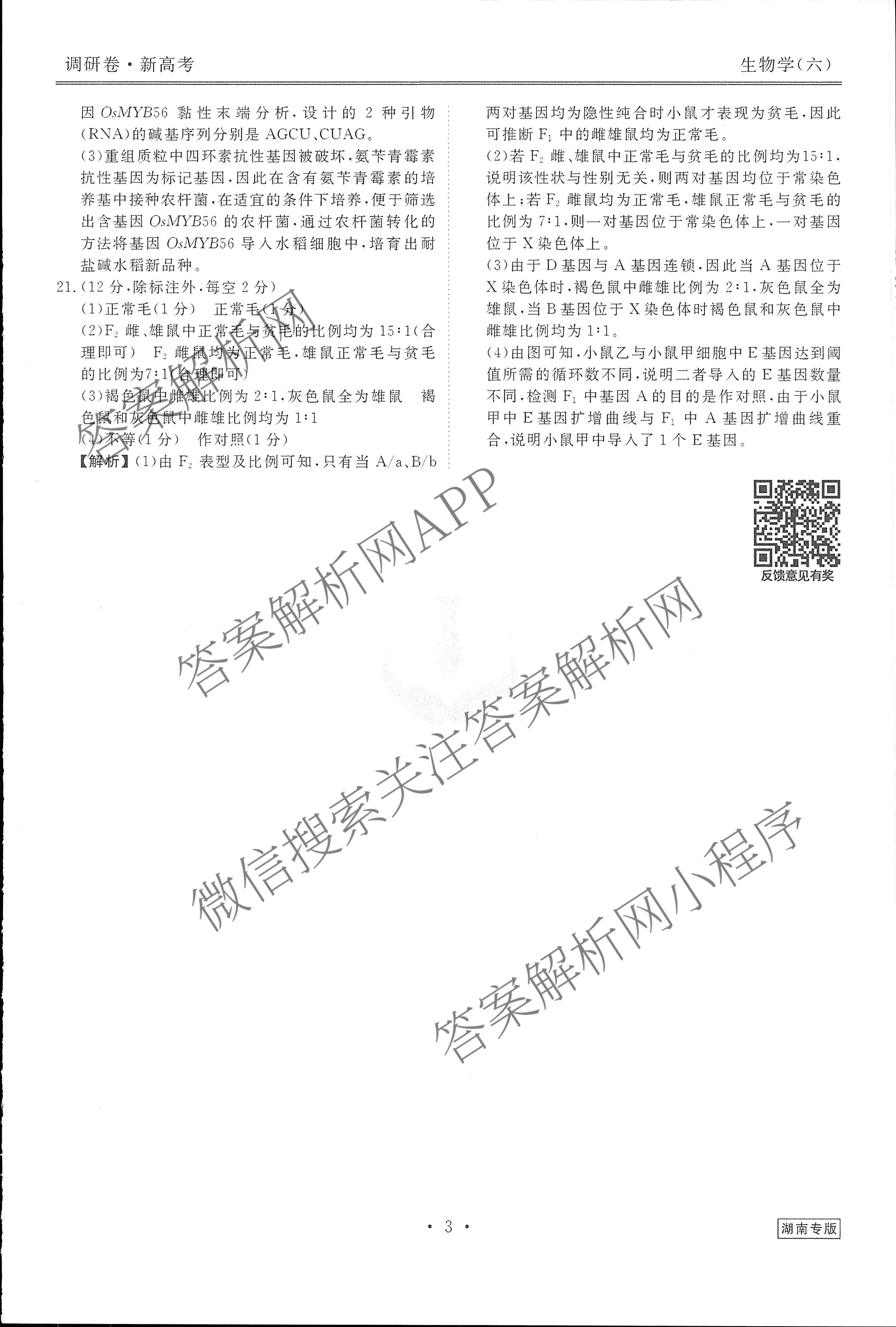 (衡水金卷先享题)调研卷 2024年普通高中学业水平选择性考试模拟试题(六)6生物(湖南专版)答案