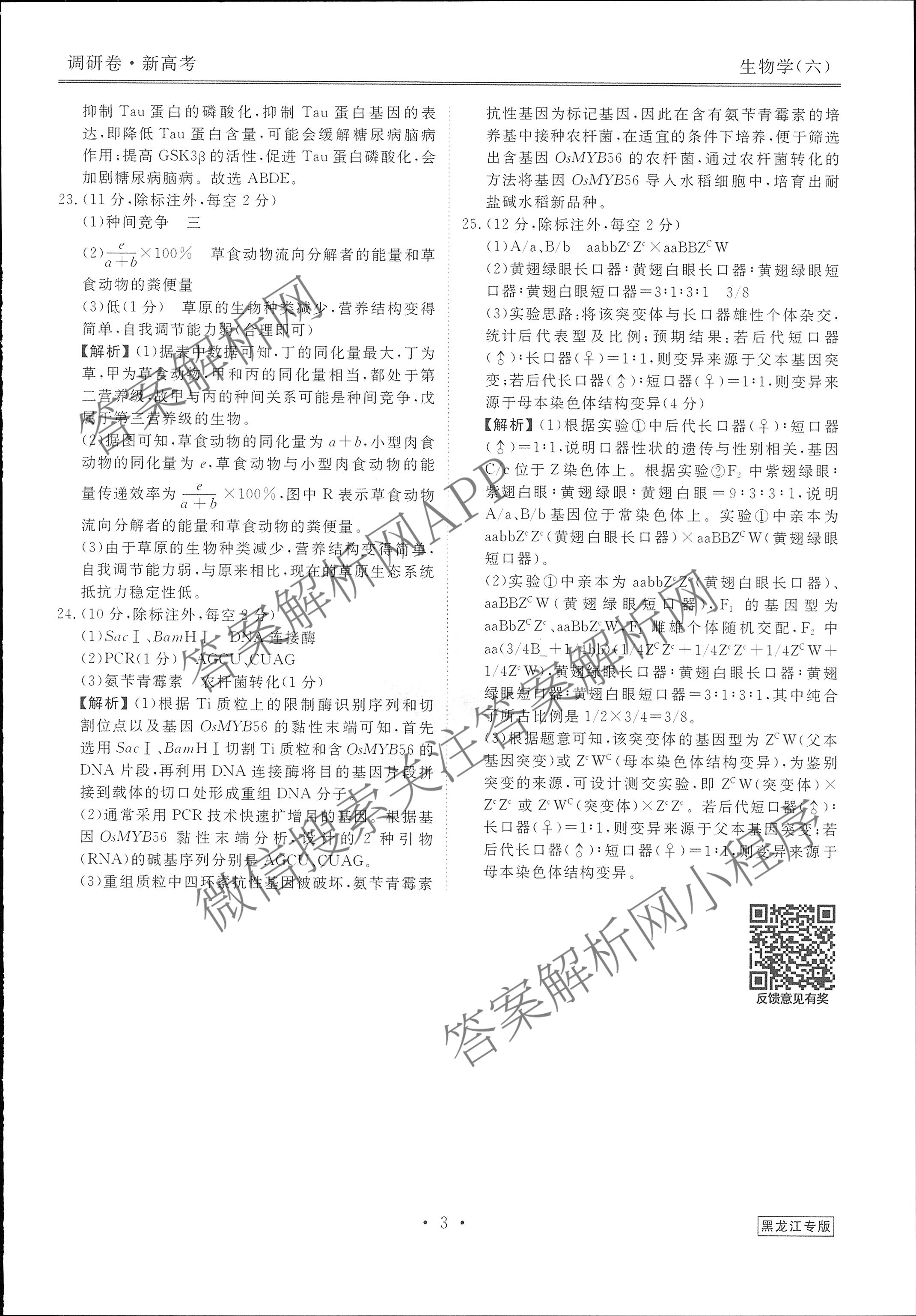 [高三](衡水金卷先享题)调研卷 2024年普通高中学业水平选择性考试模拟试题(六)6生物(黑龙江专版)答案
