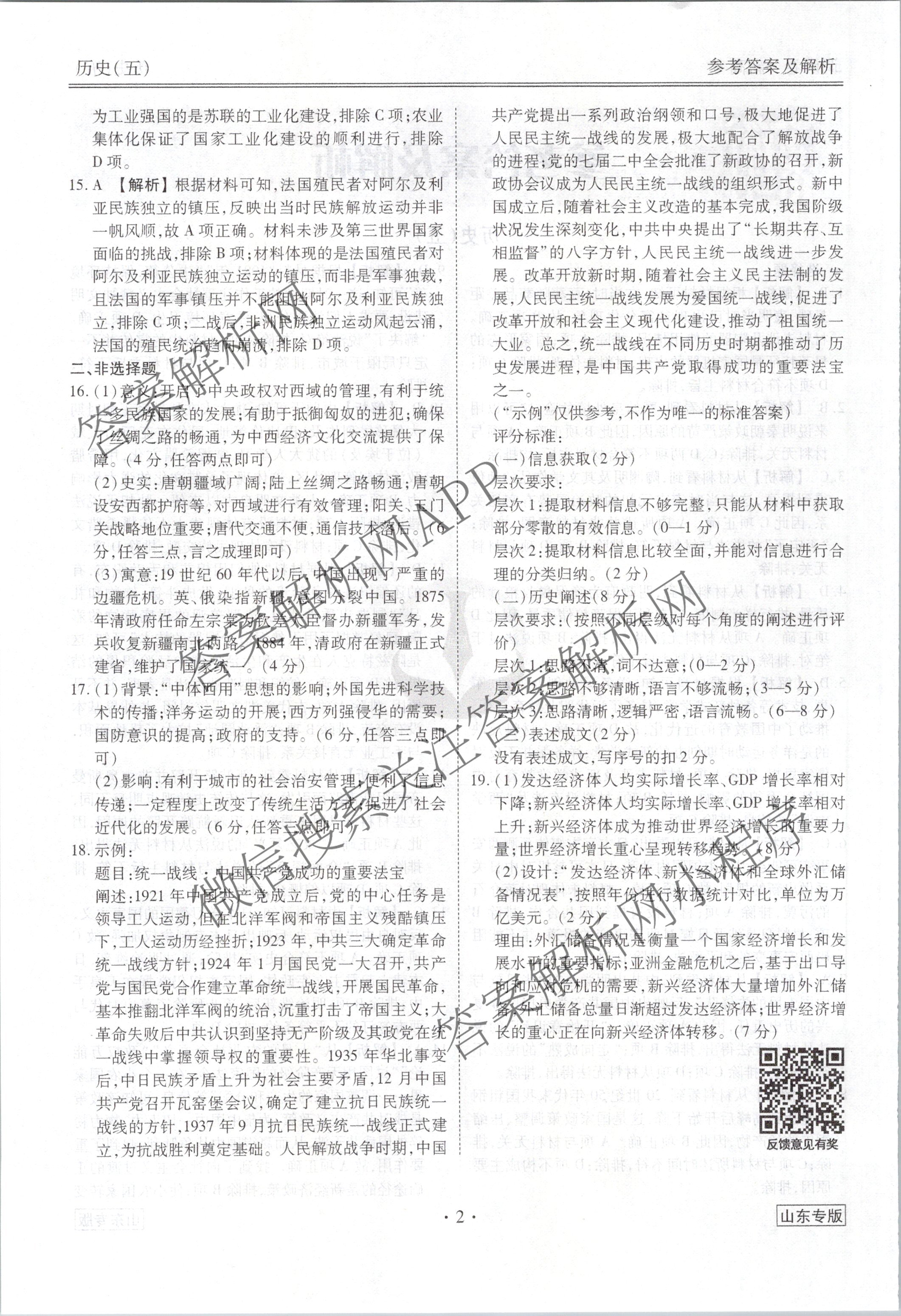 - 高三[衡水金卷先享题]·调研卷 2024年普通高中学业水平选择性考试模拟试题(五)5历史(山东专版)答案