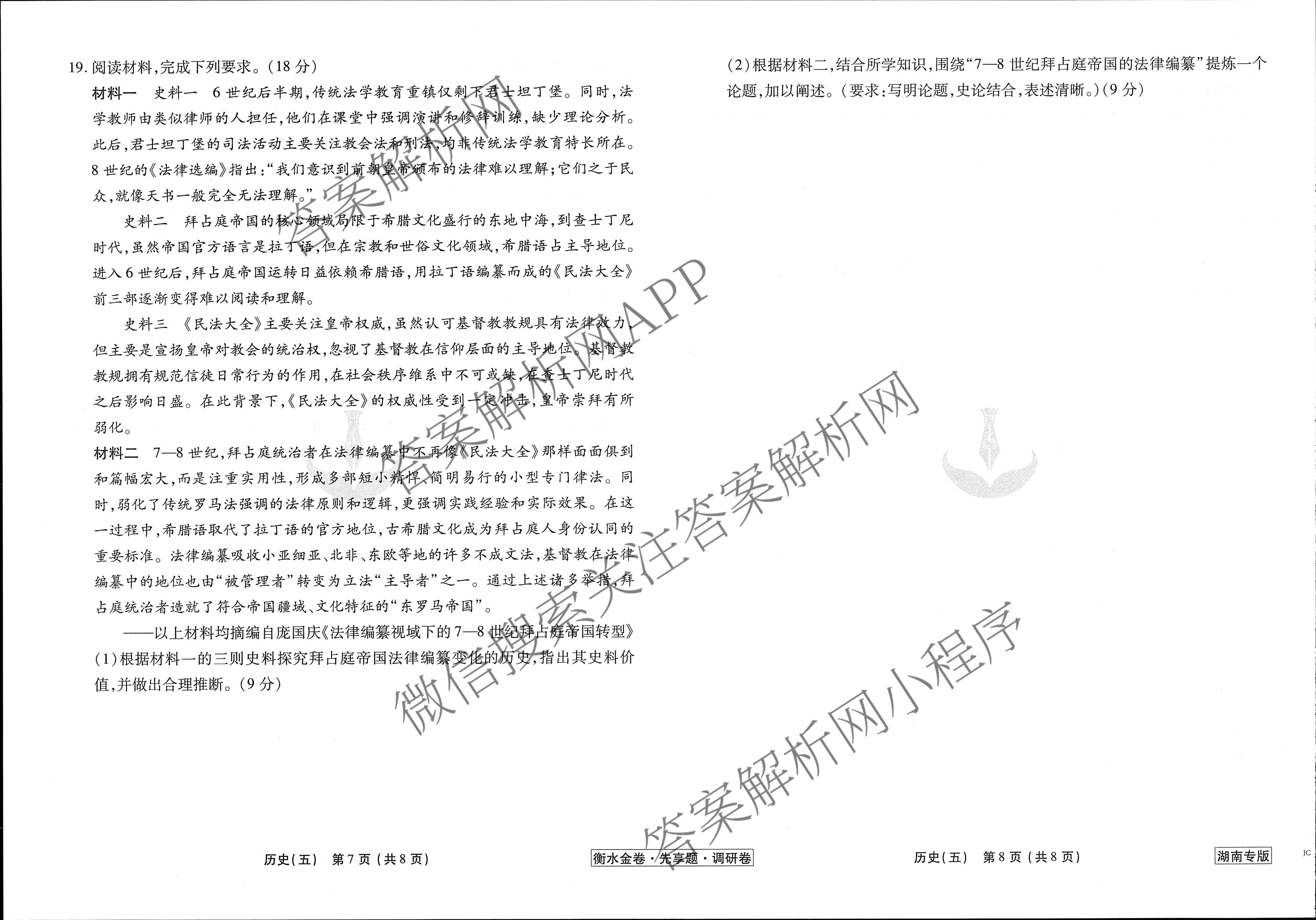- [高三](衡水金卷先享题)调研卷 2024年普通高中学业水平选择性考试模拟试题(五)5历史(湖南专版)答案