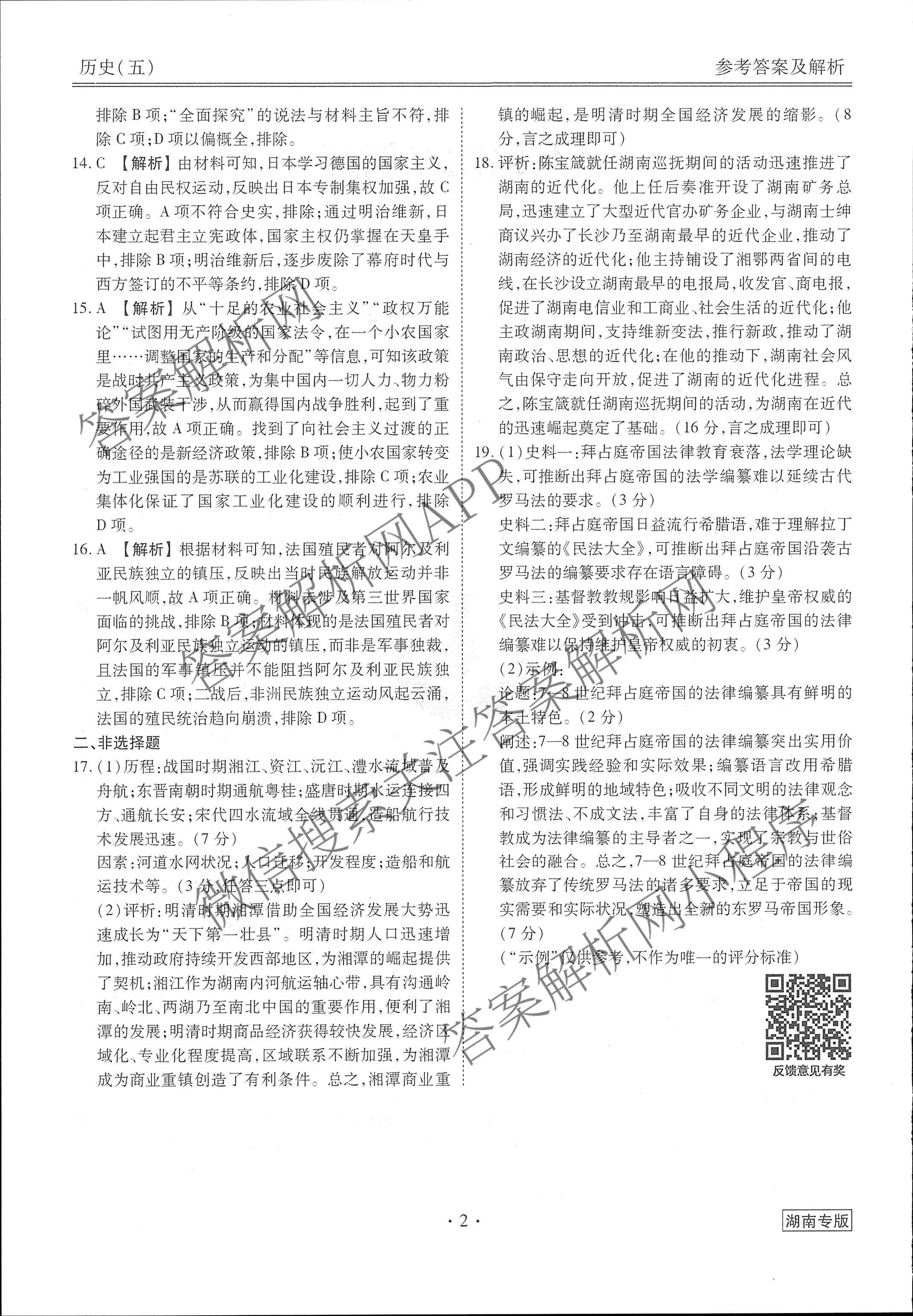 [高三](衡水金卷先享题)调研卷 2024年普通高中学业水平选择性考试模拟试题(五)5历史(湖南专版)答案