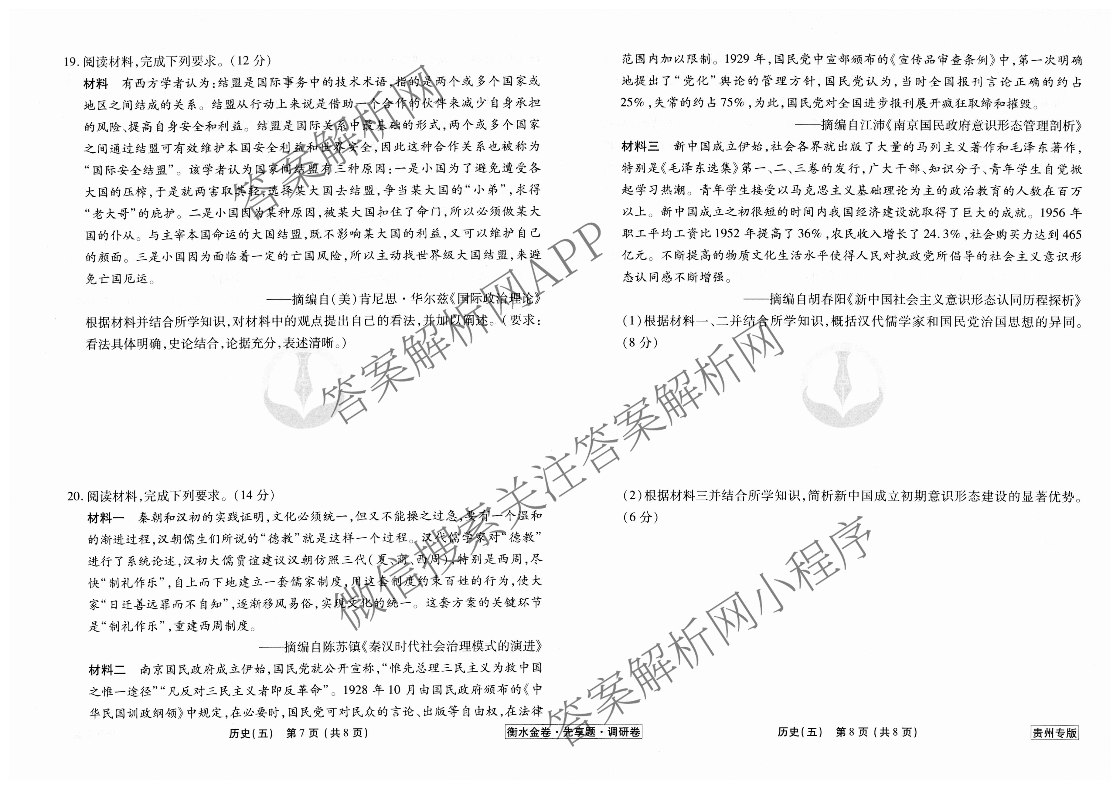 - [衡水金卷先享题]调研卷 2024年普通高中学业水平选择性考试模拟试题(五)5历史(贵州专版)答案
