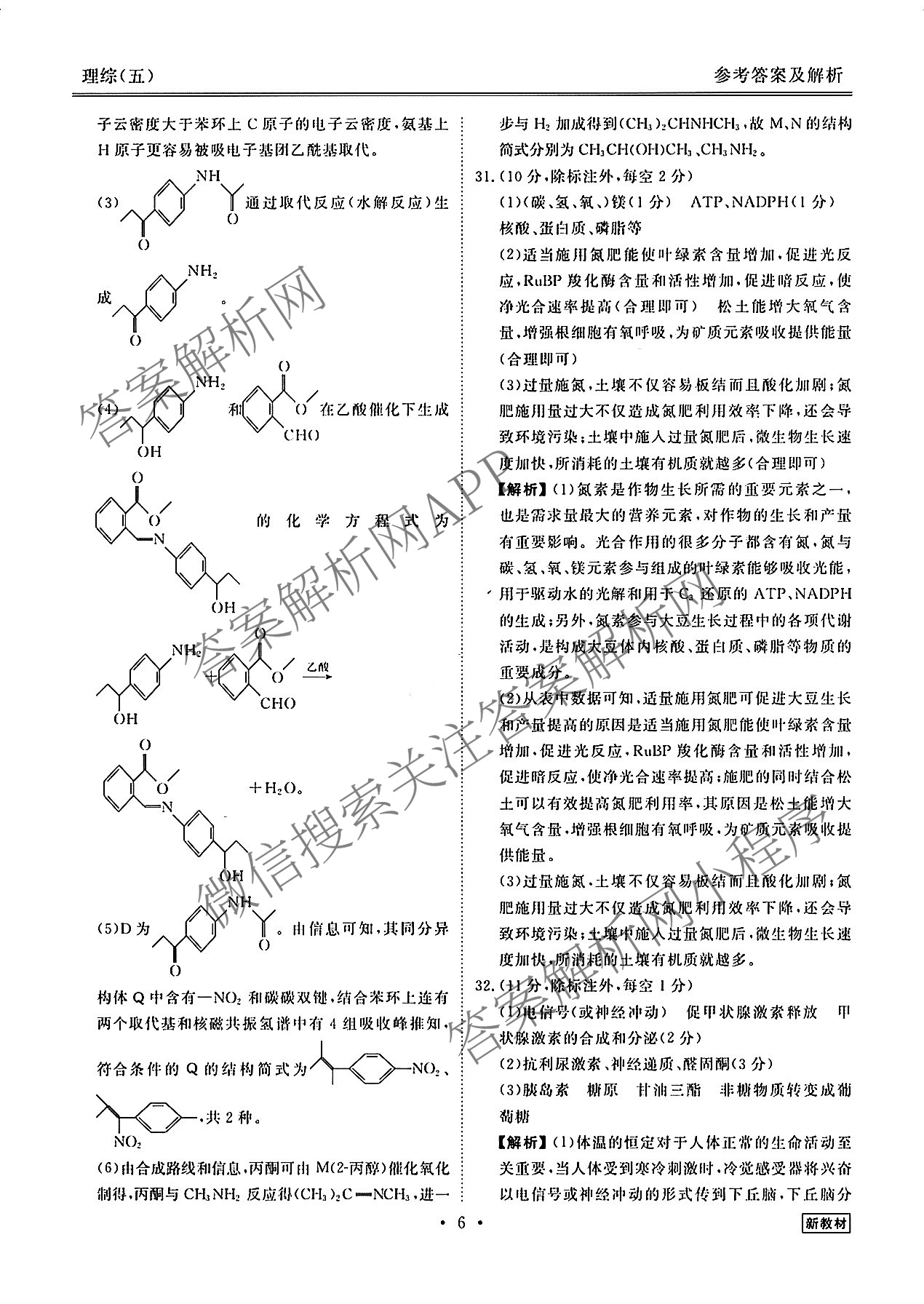 衡水金卷先享题调研卷 2024年普通高等学校招生全国统一考试模拟试题(五)5理综(新教材C)答案