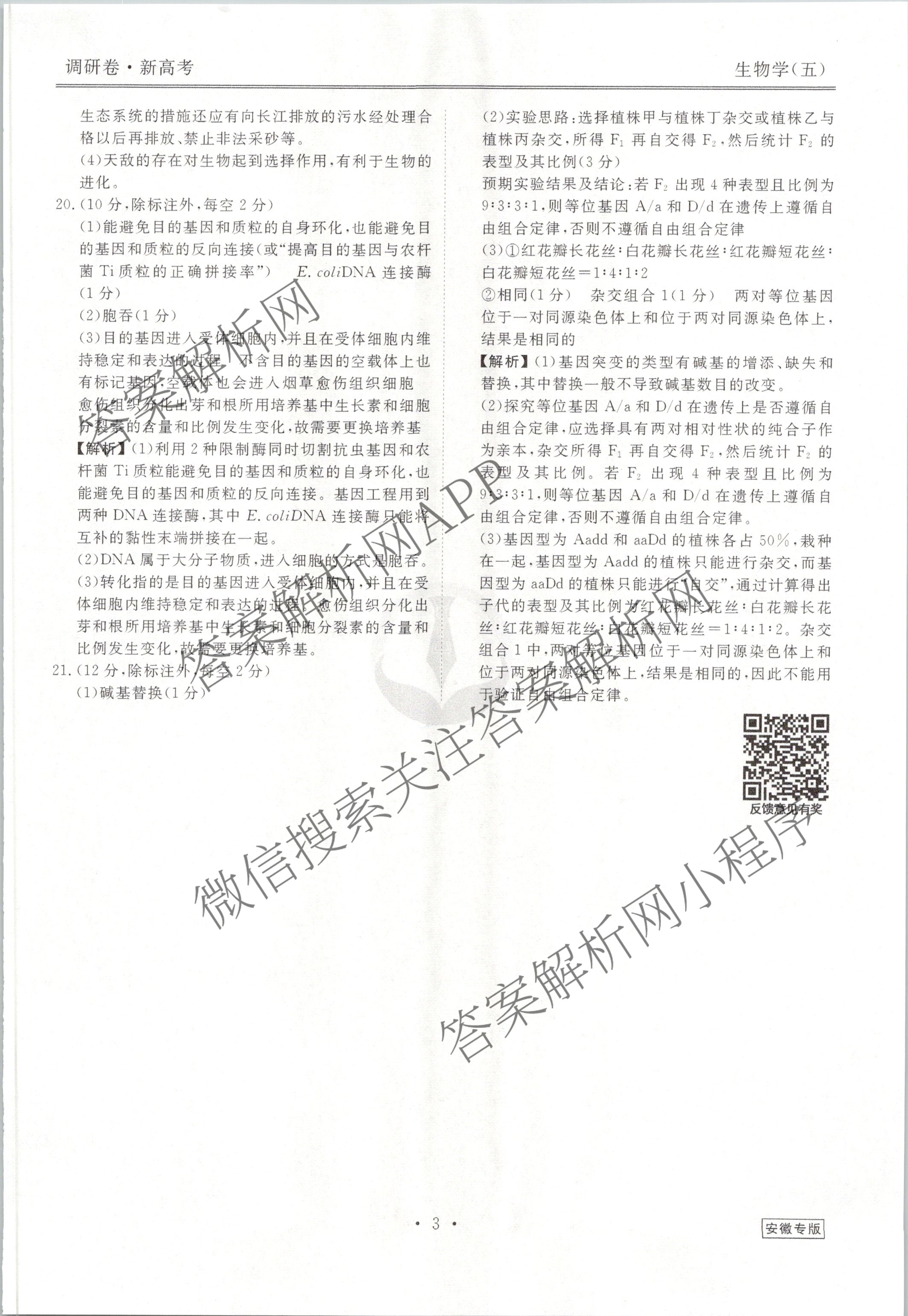 (衡水金卷先享题)调研卷 2024年普通高中学业水平选择性考试模拟试题(五)5生物(安徽专版)答案