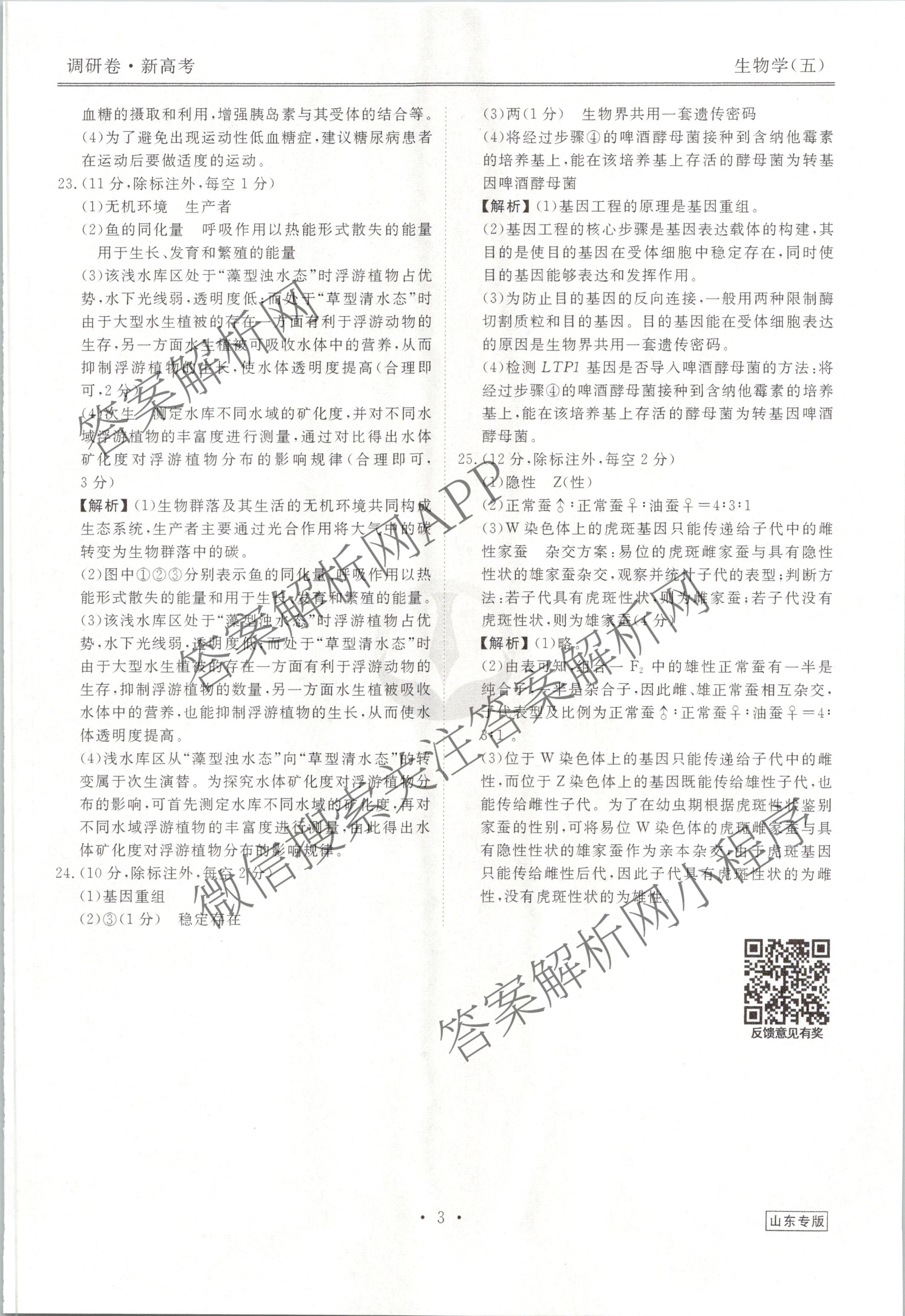 高三(衡水金卷先享题)调研卷 2024年普通高中学业水平选择性考试模拟试题(五)5生物(山东专版)答案
