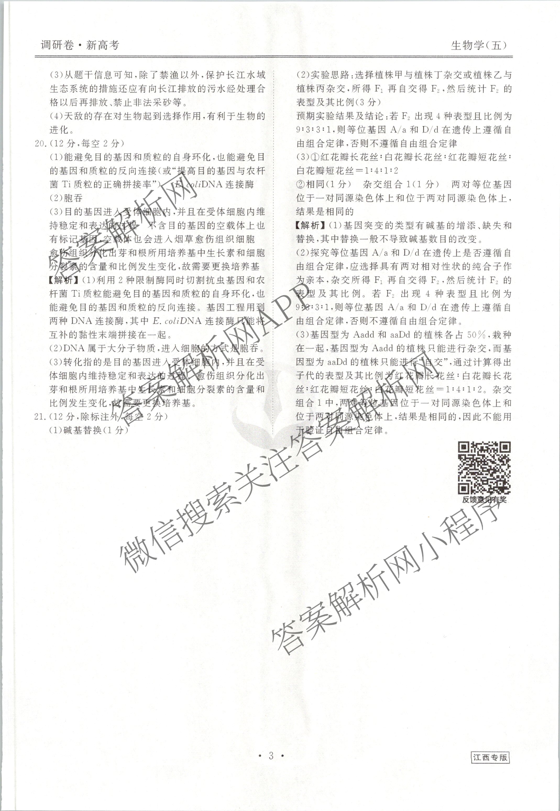 (高三)衡水金卷先享题调研卷 2024年普通高中学业水平选择性考试模拟试题(五)5生物(江西专版)答案