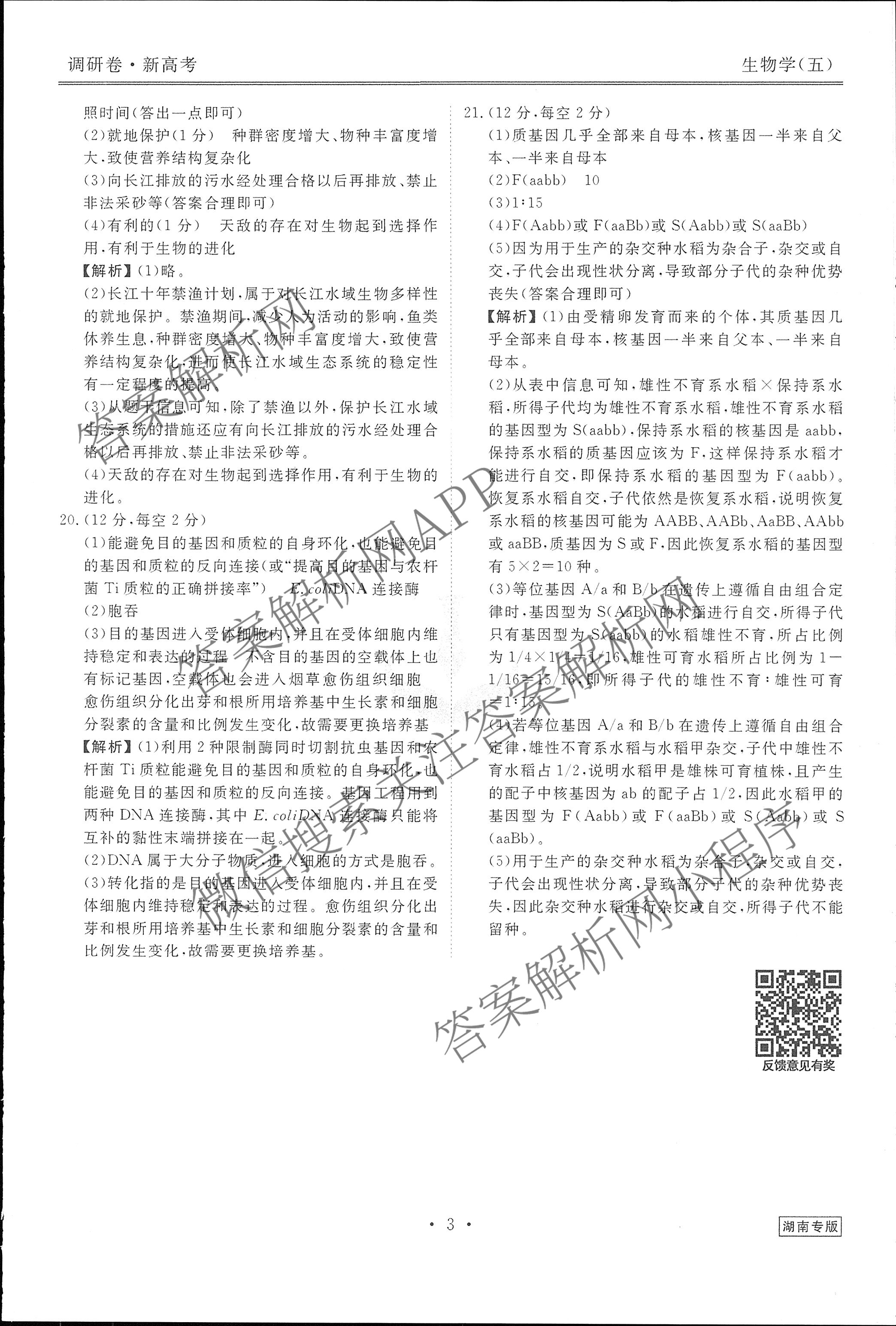 高三(衡水金卷先享题)调研卷 2024年普通高中学业水平选择性考试模拟试题(五)5生物(湖南专版)答案