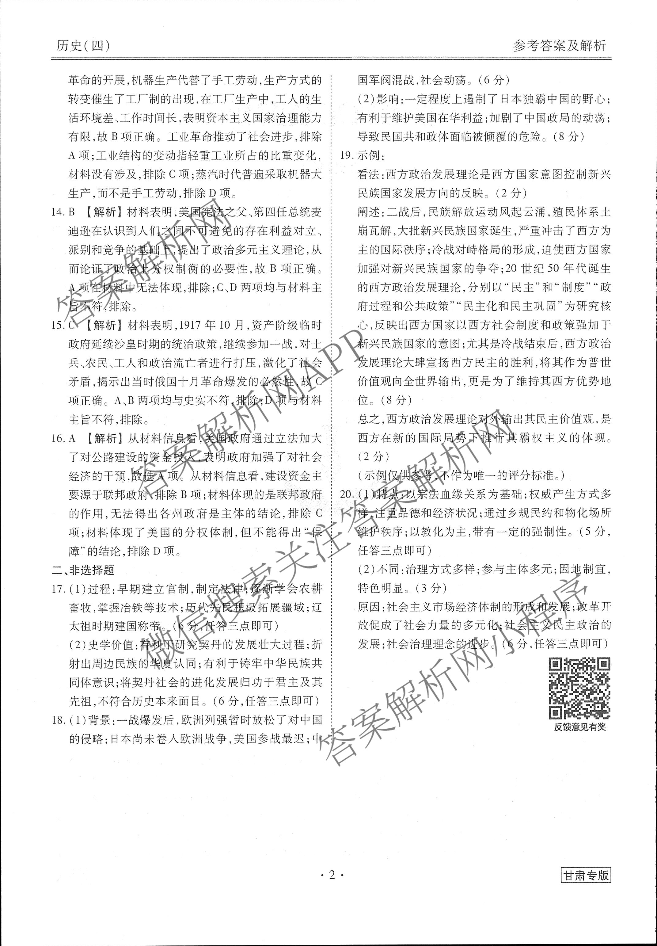 [衡水金卷先享题]调研卷 2024年普通高中学业水平选择性考试模拟试题(四)4历史(甘肃专版)答案