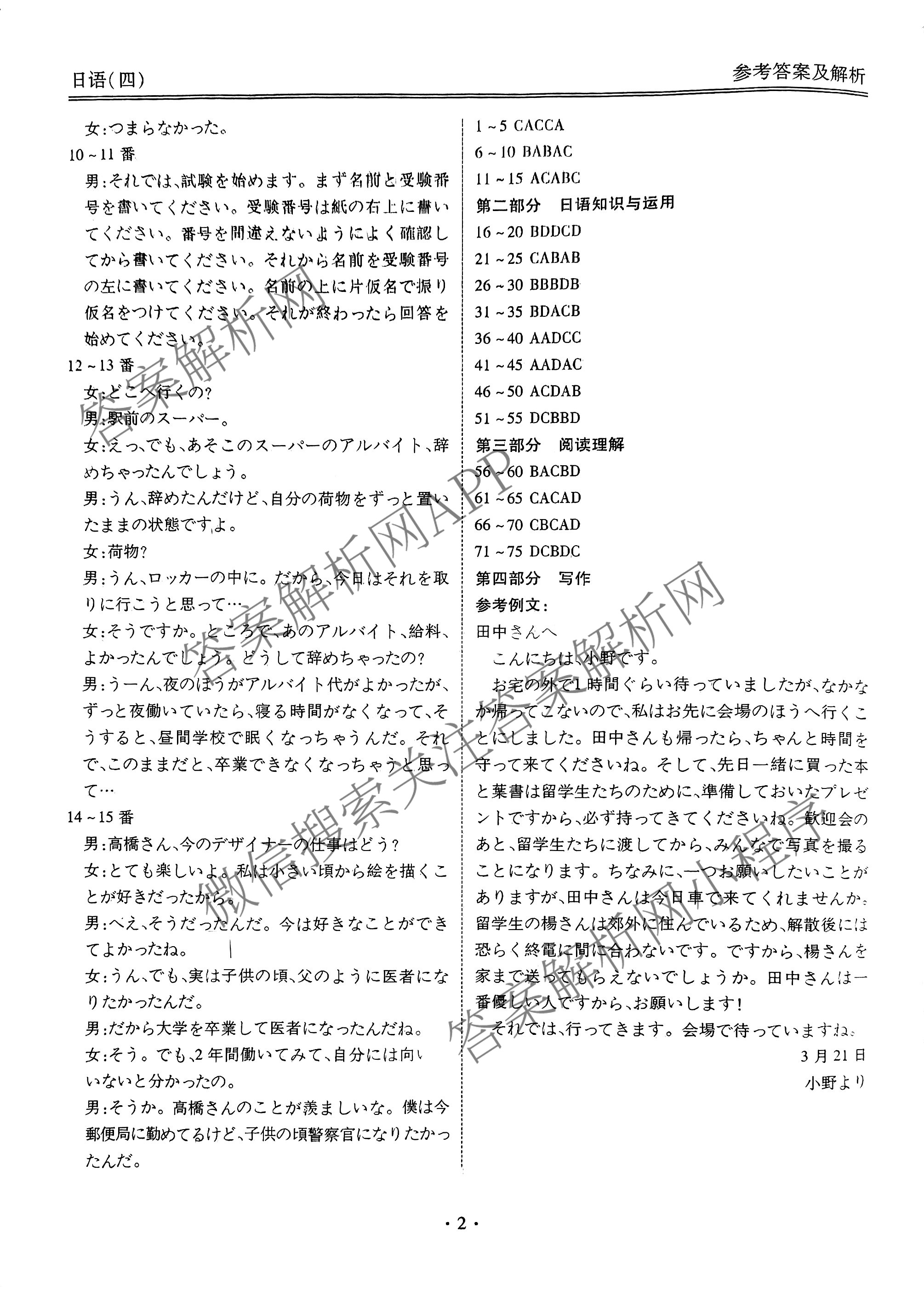 [高三]衡水金卷先享题·调研卷 2024年普通高等学校招生全国统一考试模拟试题(四)4日语答案