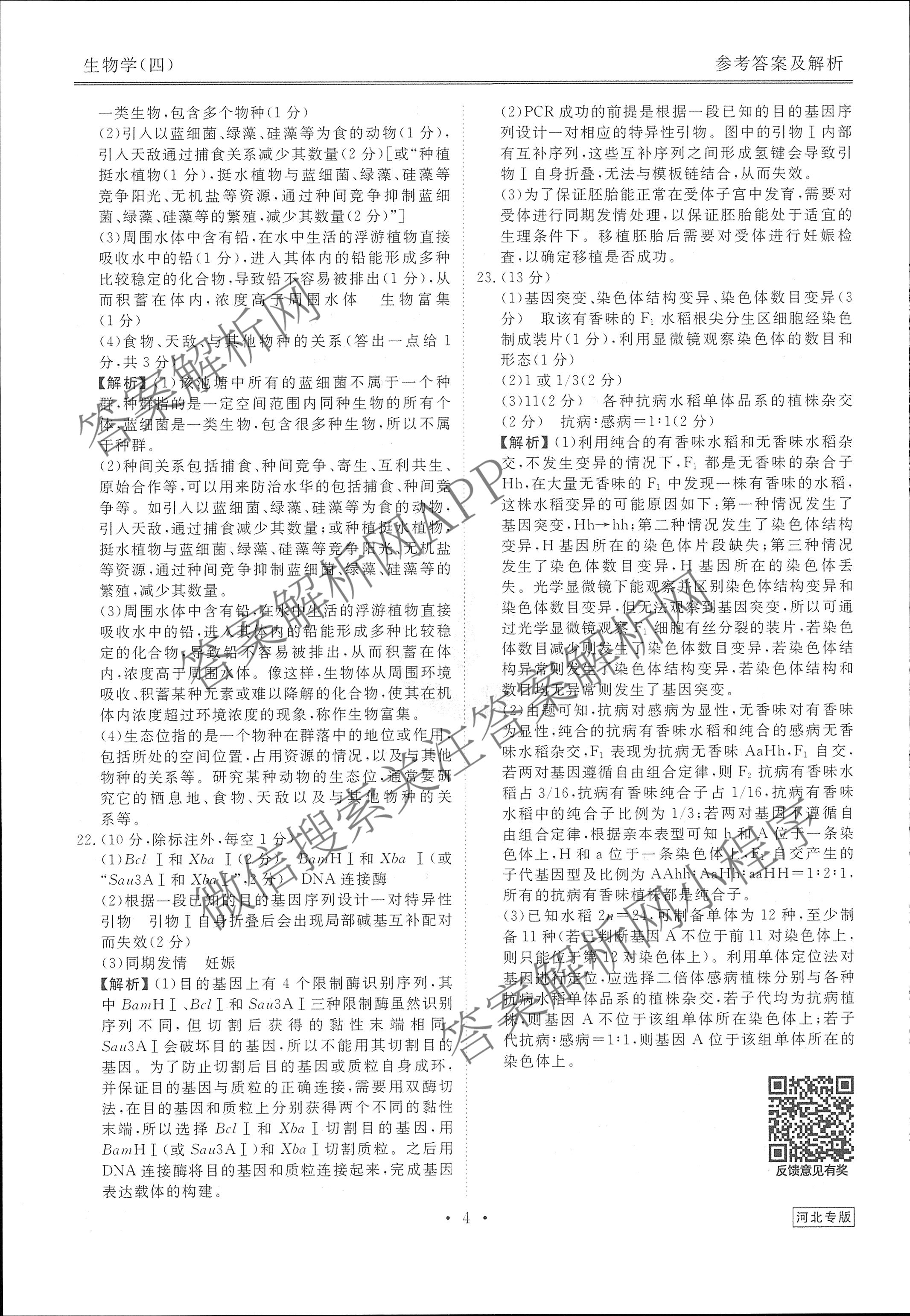 高三(衡水金卷先享题)·调研卷 2024年普通高中学业水平选择性考试模拟试题(四)4生物(河北专版)答案