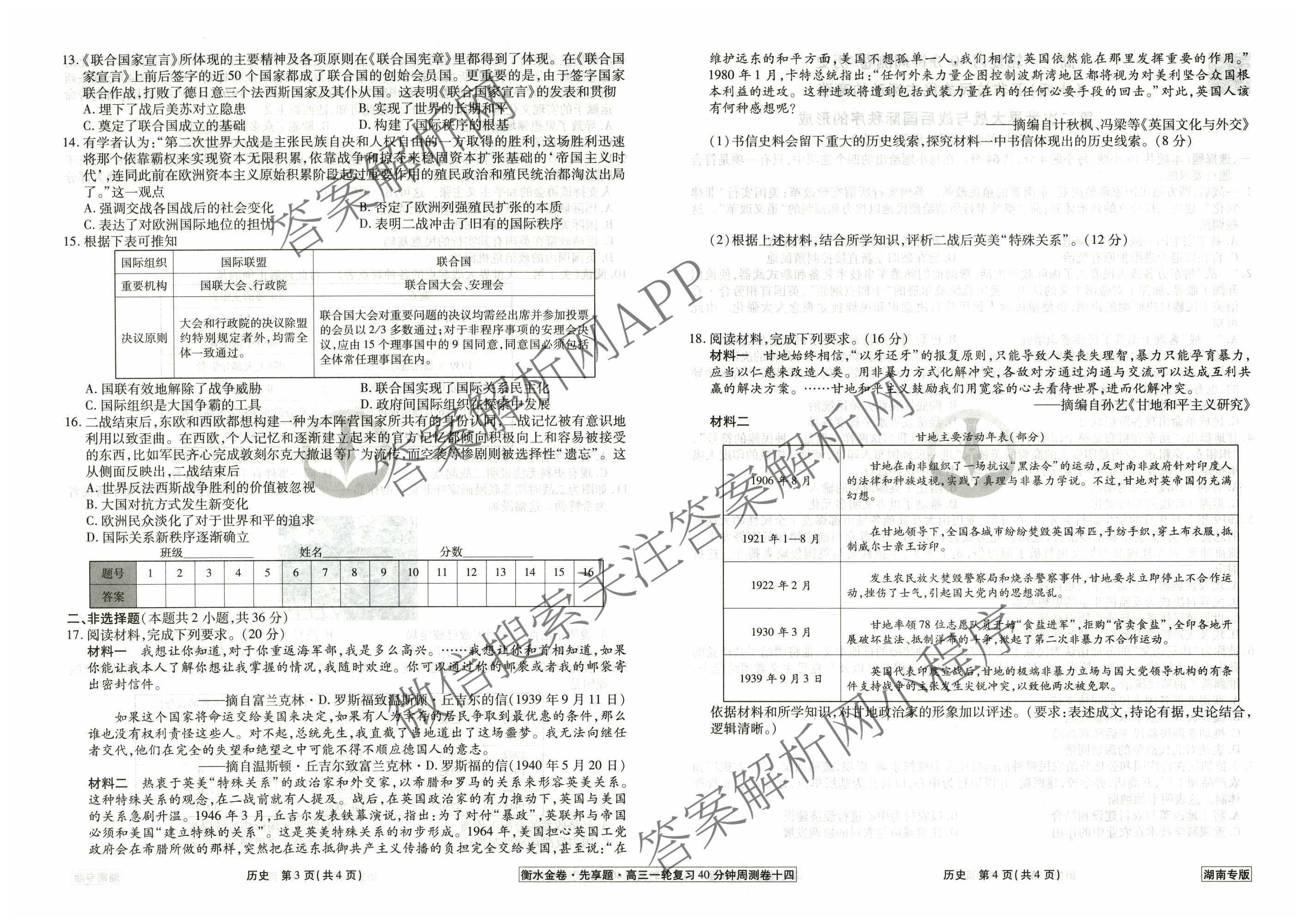 - (高三)2024~2025(衡水金卷先享题)一轮复习40分钟周测卷历史(湖南专版)(十四)14答案