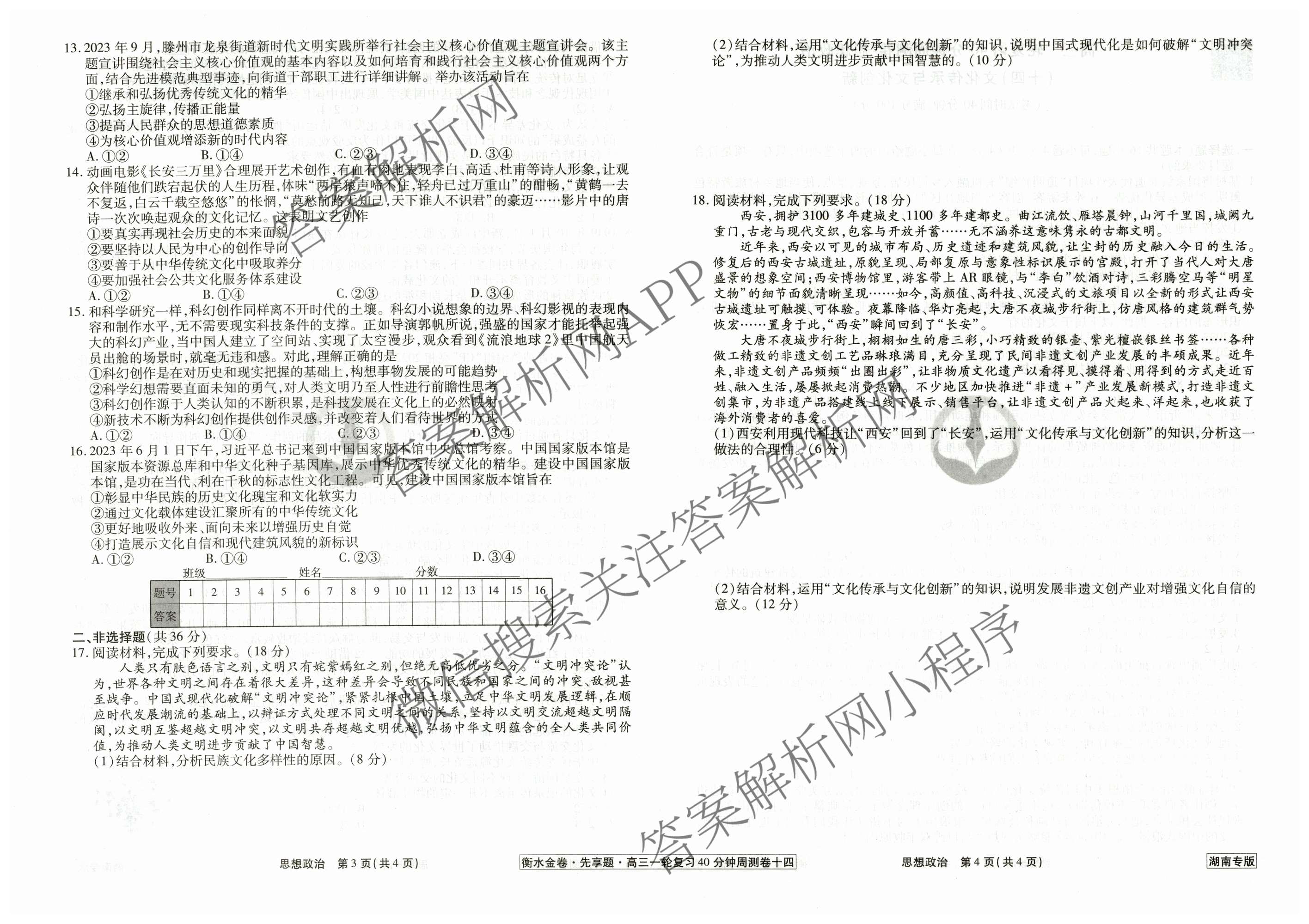 - 2024~2025[衡水金卷先享题]·(高三)一轮复习40分钟周测卷·政治(湖南专版)(十四)14答案