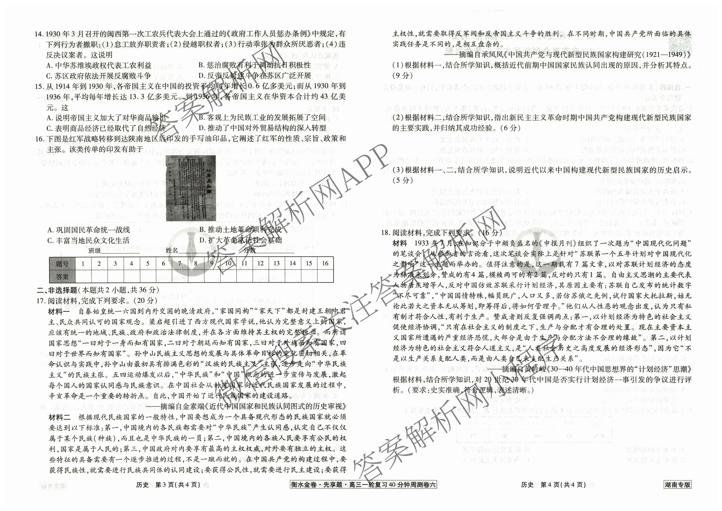 - 2024-2025(高三)[衡水金卷先享题]·一轮复习40分钟周测卷·历史(湖南专版)(六)6答案