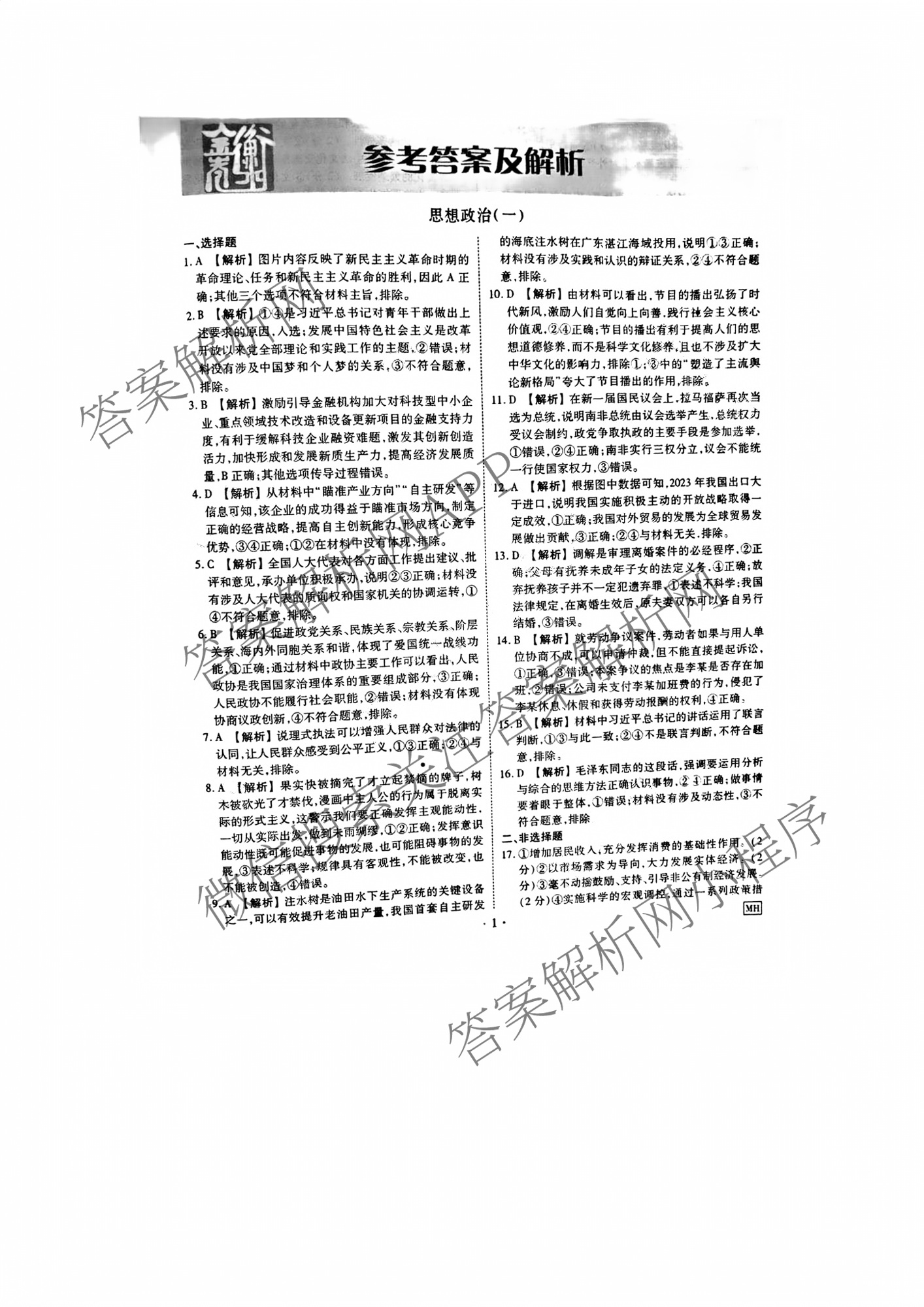 - [高三]衡水金卷先享题摸底卷 2024~2025学年度一轮复习摸底测试卷(一)1政治(HN)答案