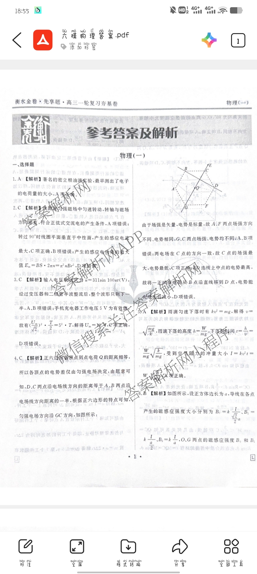 - (高三)(衡水金卷先享题)夯基卷 2025年普通高中学业水平选择性考试模拟 物理(W)(一)1答案