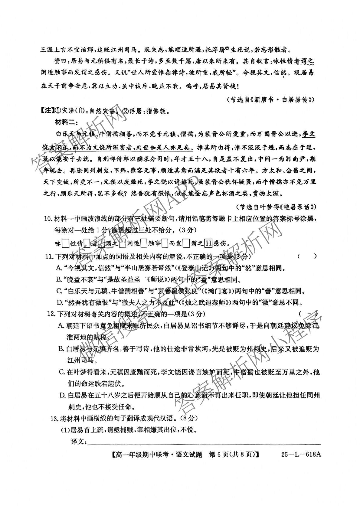 - 2024~2025安徽省学年度第二学期(高一)年级期中联考(25-L-618A)语文试题