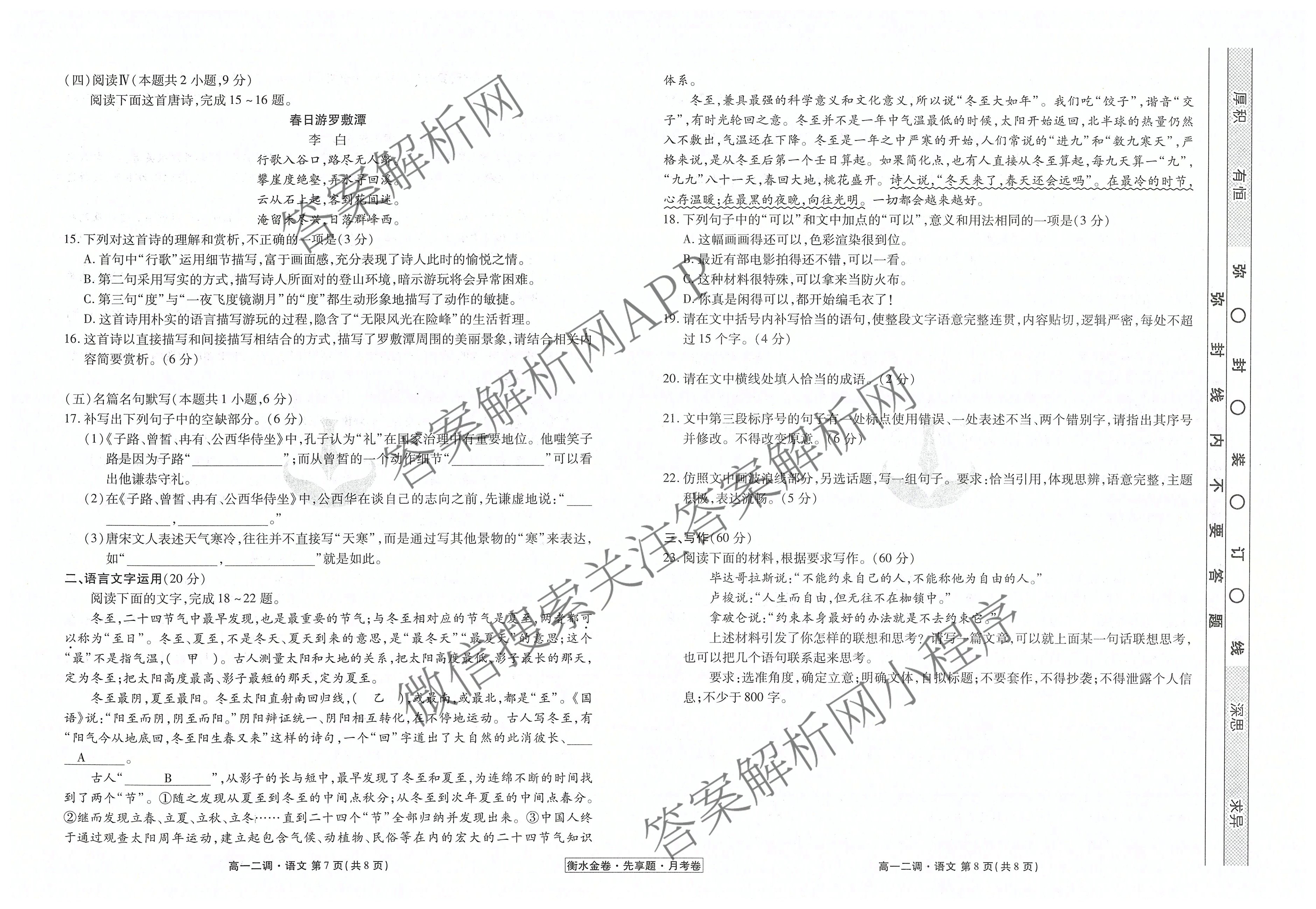 衡水金卷先享题·月考卷·2024-2025学年度下学期高一年级二调考试语文试题,目前衡水金卷先享题答案网已经汇总了衡水金卷先享题·月考卷·2024-2025学年度下学期高一年级二调考试语文试题的各科答案和试卷,获取更多衡水金卷先享题答案解析,请在关注本站。