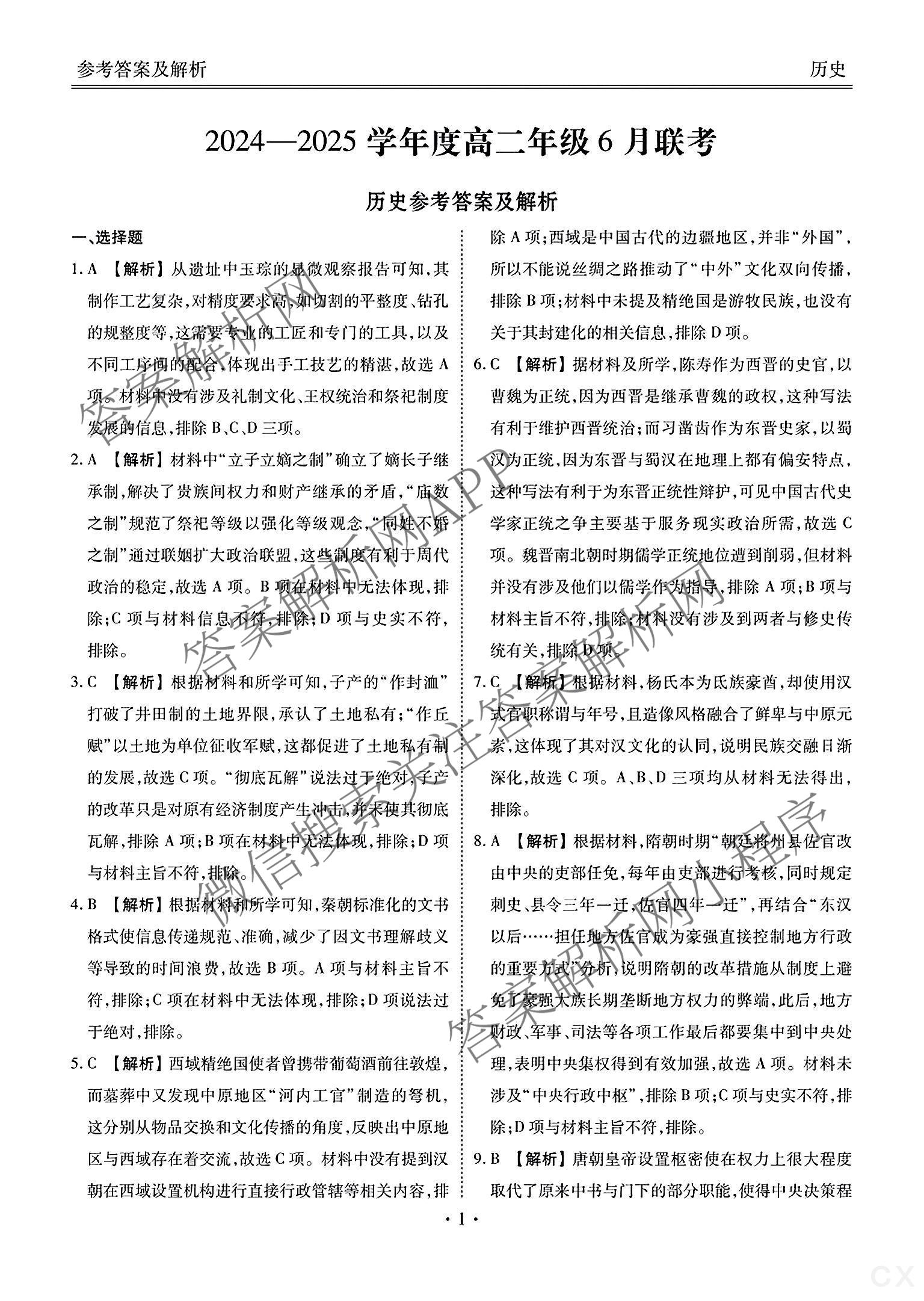 2024~2025衡水大联考学年度高二年级6月联考历史答案